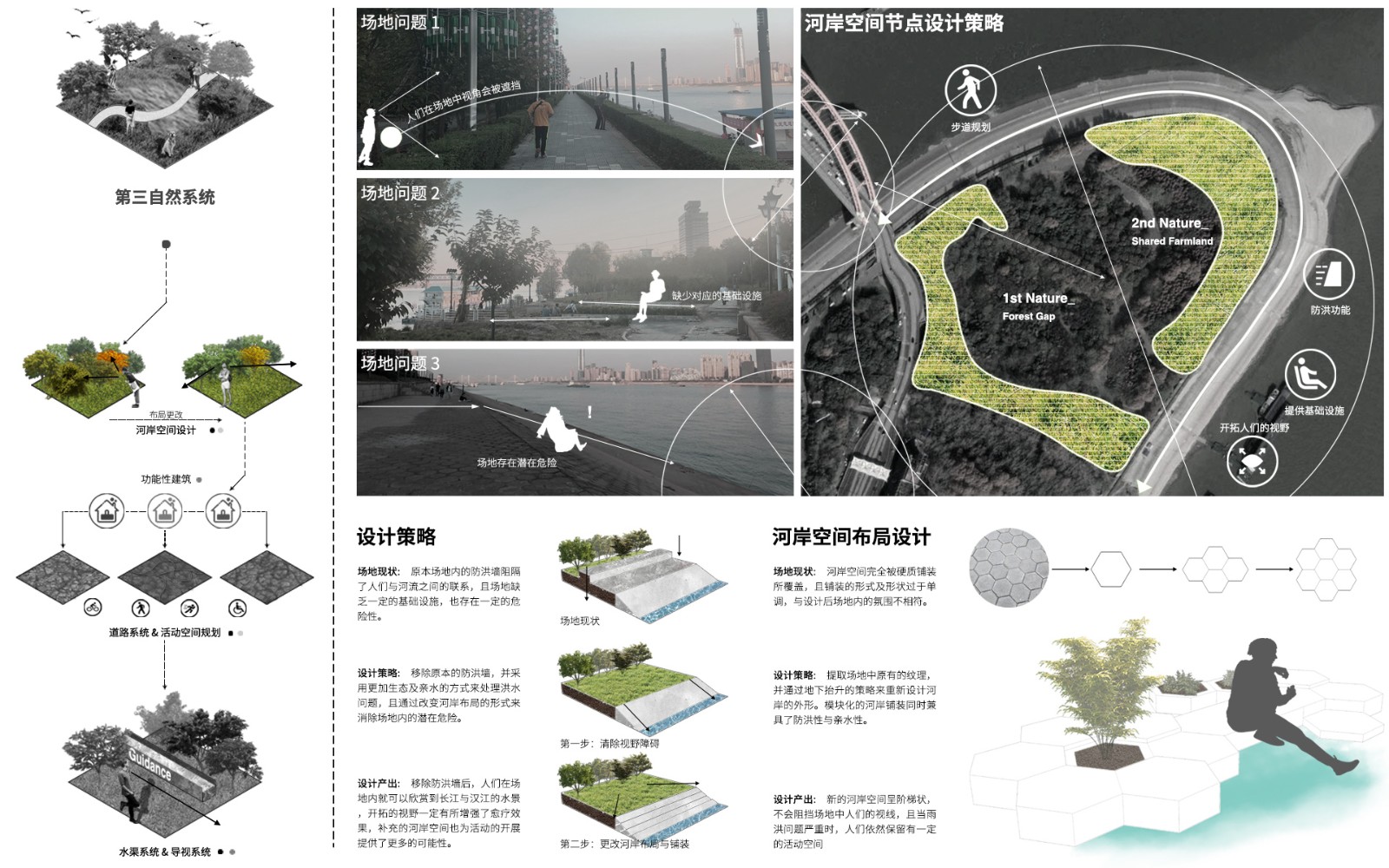 ▲第四個(gè)節(jié)點(diǎn)是河岸空間,目的是打開原本場(chǎng)地內(nèi)封閉的空間和被遮擋的視野,解決場(chǎng)地內(nèi)的一些基礎(chǔ)設(shè)施的問題。