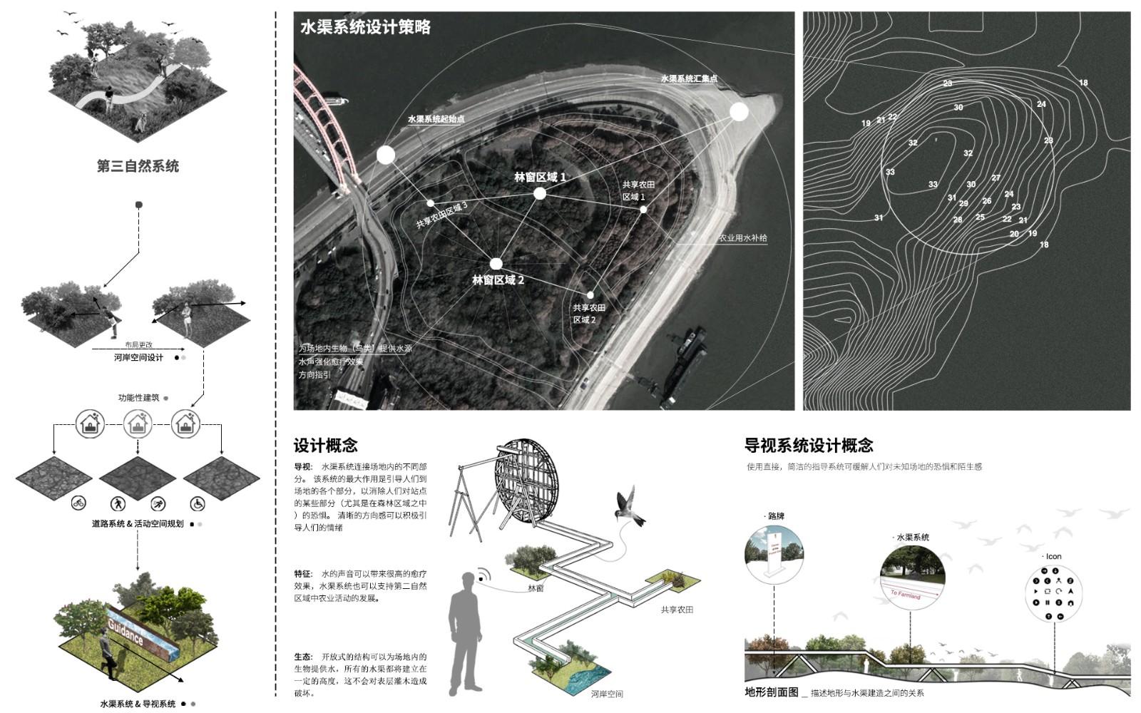 ▲最后一個(gè)節(jié)點(diǎn)是水渠系統(tǒng)。目的是在聽覺方面,利用水聲進(jìn)行愈療效果,并且創(chuàng)造一個(gè)貫穿整個(gè)場(chǎng)地的導(dǎo)視系統(tǒng)。