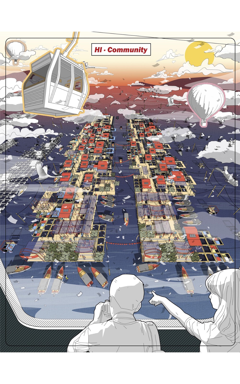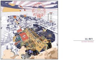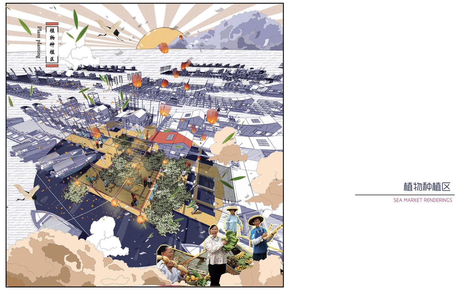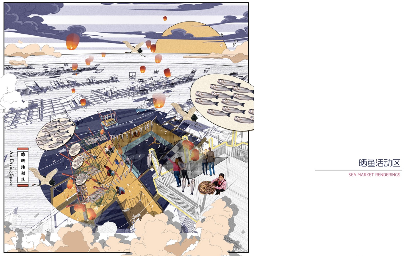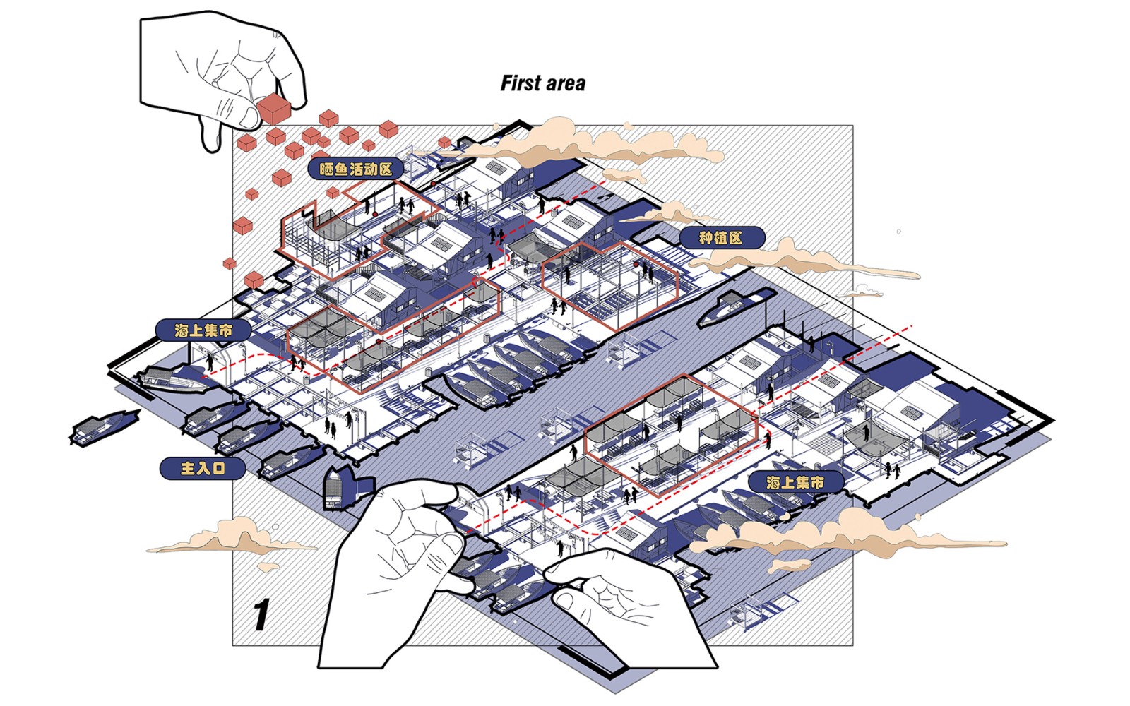 ▲入口第一個(gè)片區(qū),為公共空間。海上集市占據(jù)大部分公共區(qū)域,其次還有曬魚(yú)活動(dòng)區(qū)及植物種植區(qū)。