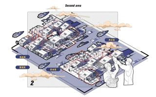 方案分為三個(gè)片區(qū)去進(jìn)行設(shè)計(jì)。第一個(gè)片區(qū)為融合區(qū),海上集市占據(jù)大部分公共區(qū)域,其次還有植物種植區(qū)和曬魚(yú)活動(dòng)區(qū),在這個(gè)片區(qū)中,單元的植入主要作用為融合內(nèi)部空間。第二個(gè)片區(qū)屬于整體漁排的中段,為共享區(qū),植入的功能為相對(duì)安靜的居住空間,植入共享空間增進(jìn)游客與居民的聯(lián)系。第三片區(qū)為活動(dòng)區(qū),主要植入大型體驗(yàn)空間以及漂浮單體,大型體驗(yàn)區(qū)主要連接內(nèi)部空間,漂浮單體主要連接外界空間。主要是給游客一個(gè)全新海洋與文化體驗(yàn)。