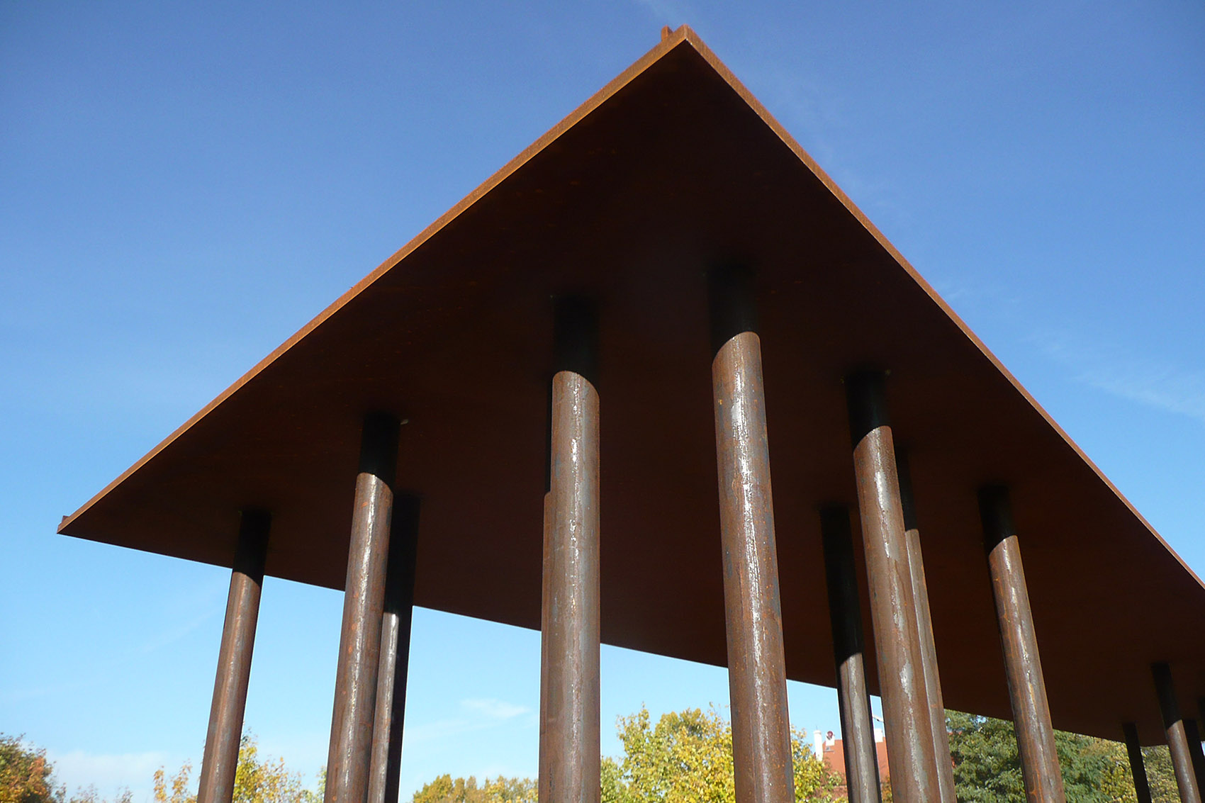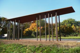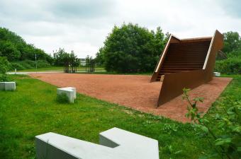場地毗鄰區(qū)域自行車道網。首先映入眼簾的是入口處的耐候鋼廊架。作為車道的起始點,它為騎行者及其他游客提供了集合調整和休憩的空間。這個區(qū)域的設置銜接了河濱公園與城市自行車網絡,使城市開放空間得到更有效的利用。場地毗鄰新建的管道研究中心,因此廊架“就地取材”使用管道作為支柱。