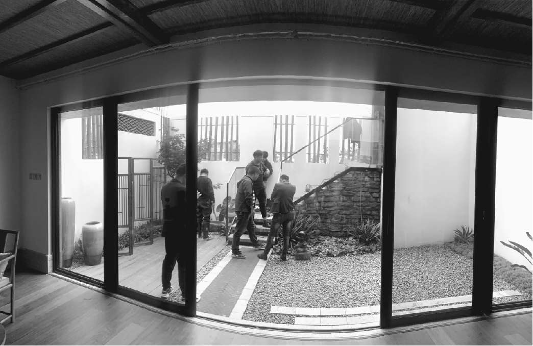 將小院的戶外平臺與草坪區(qū)域以平行相接的方式相連,使二者形成一個等高界面,在視覺效果和活動空間上極大地拓展了小院的連通性和延伸性。