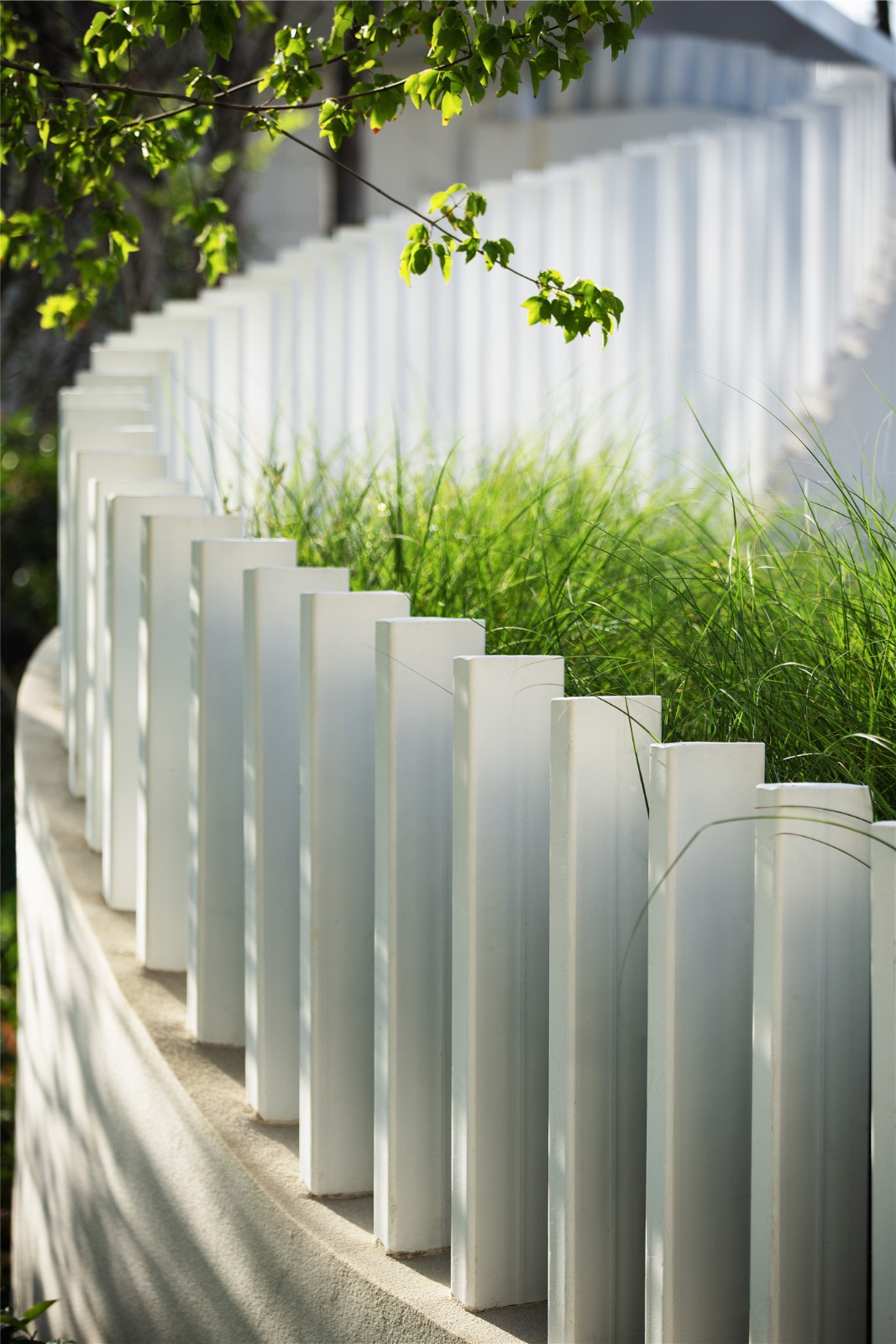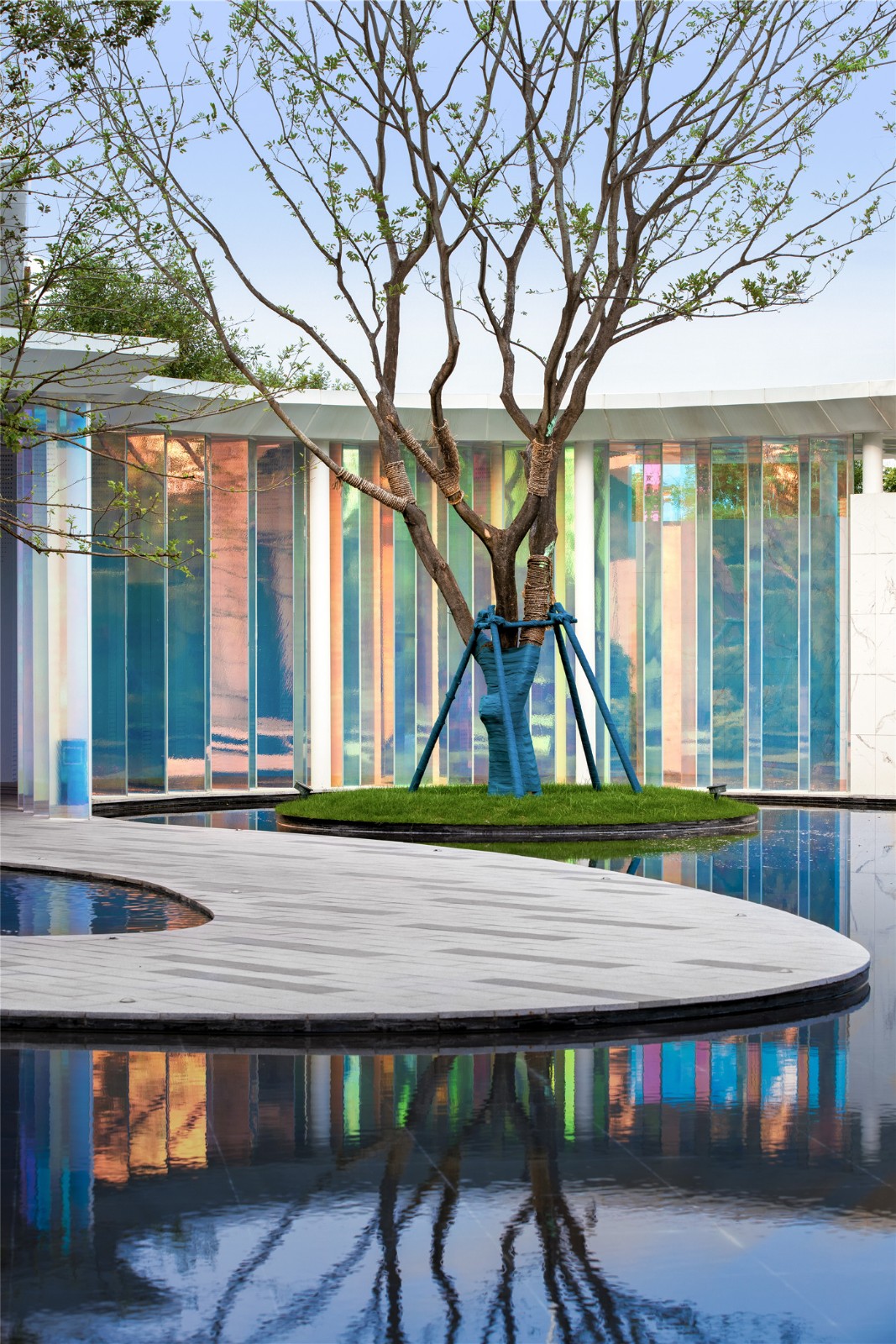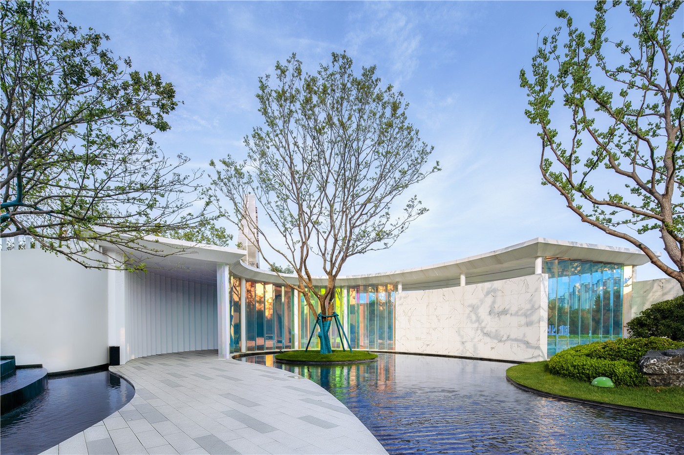 走出“彩虹”連廊,粼粼清波,微瀾水鏡與汀州植物交相輝映,前景、倒影形成一個(gè)秩序的美感空間,生活的儀式感從這里開(kāi)始。綠意林饒,水影交匯。生活因而融于自然之中,情感因此融于空間之中,住宅的本質(zhì)正在于此。