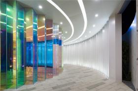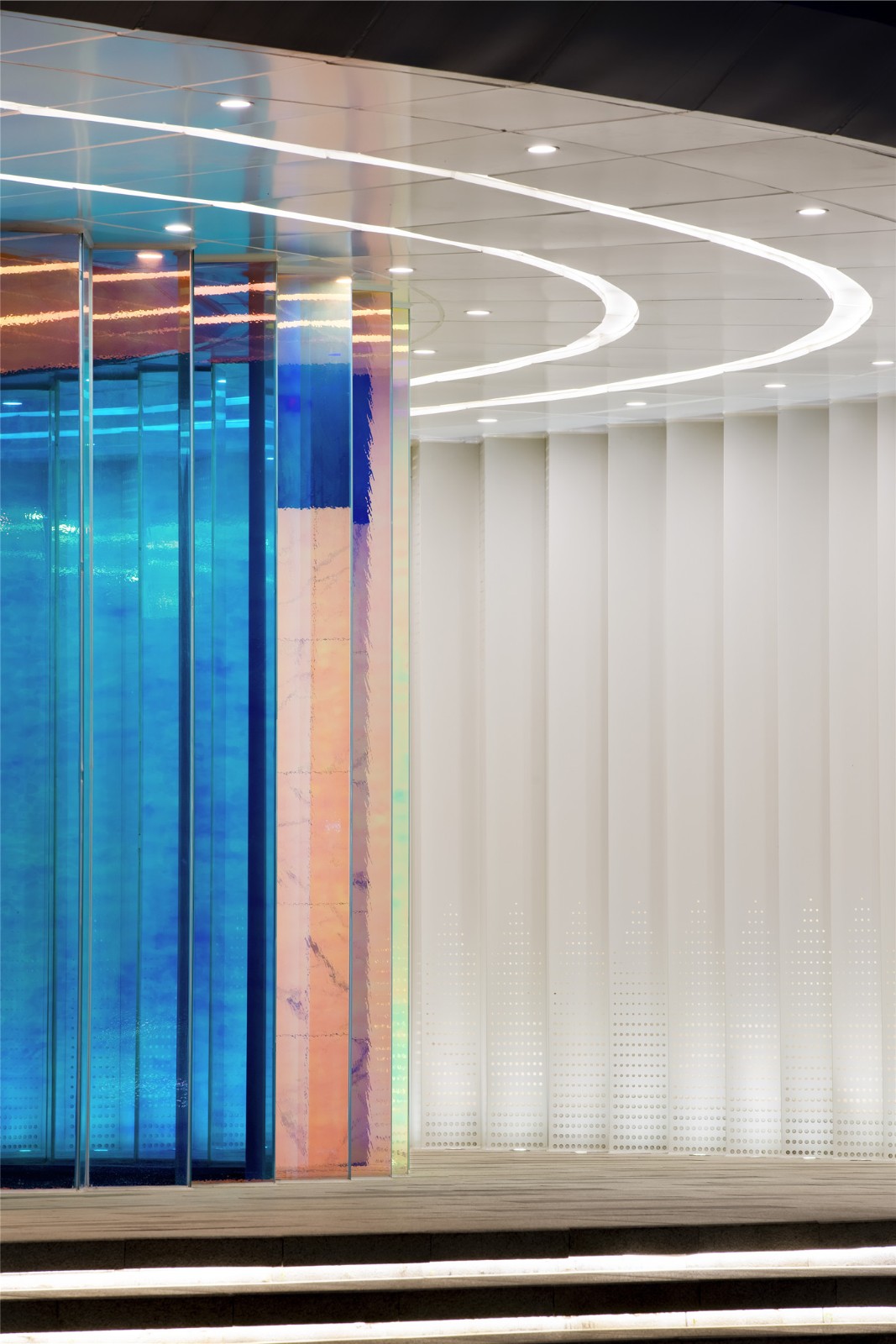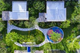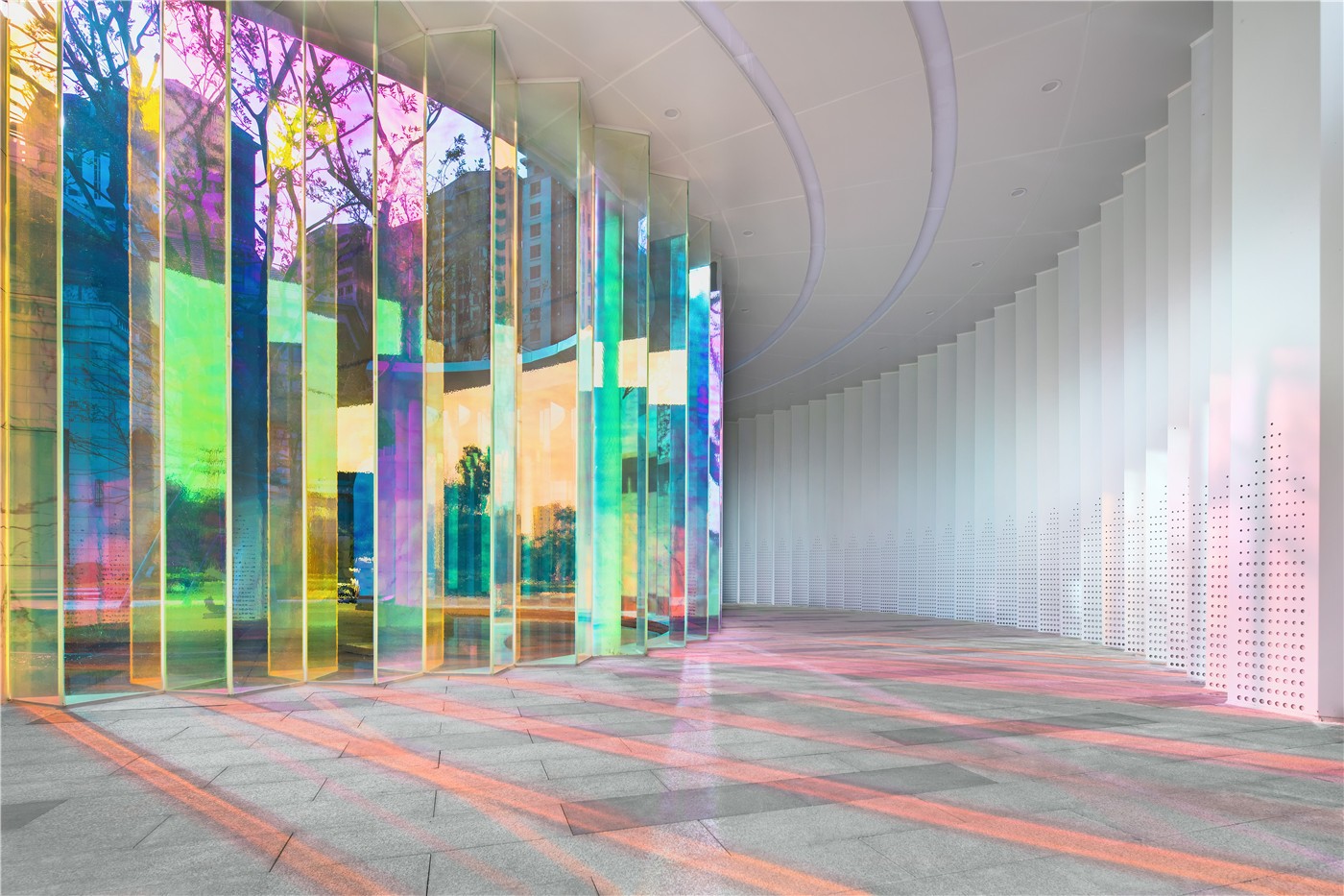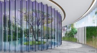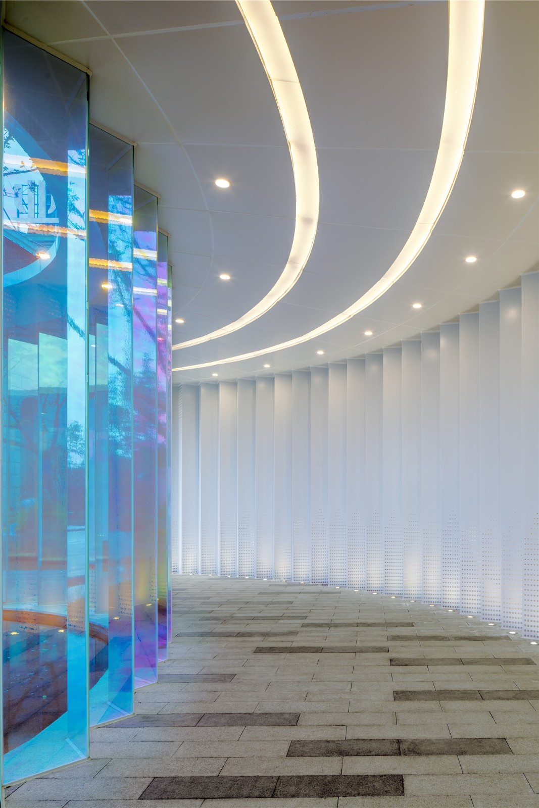 光影下,變幻莫測(cè)的藝術(shù)長(zhǎng)廊浮現(xiàn)眼前,斑斕陸離的彩色光影長(zhǎng)廊隔絕外部浮躁,加強(qiáng)空間的延展感?;乜闯鞘?,是繁華與喧囂;前向庭院,是靜謐與自然。漫步前行,心境也變得輕快明朗,對(duì)生活躍躍向往。