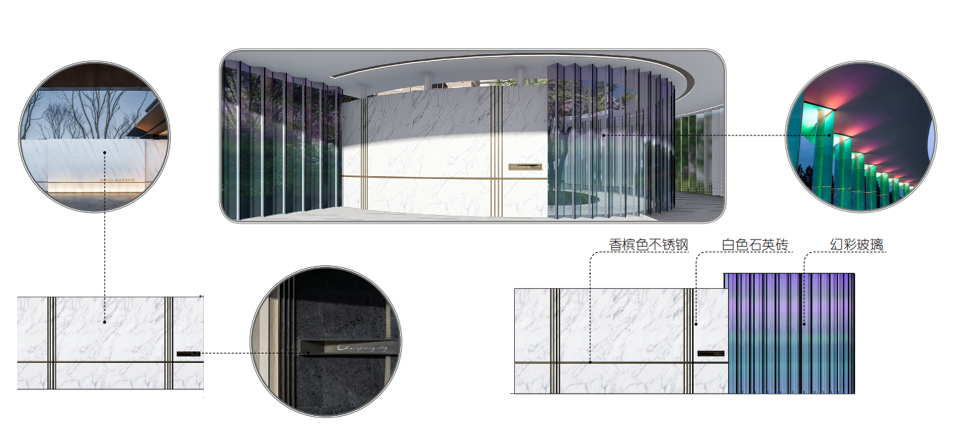 展示區(qū)入口,設(shè)計(jì)造型簡(jiǎn)潔利落,雅白基調(diào)配以大氣石英磚紋路,打造猶如藝術(shù)館般的禮儀之門,賦予空間藝術(shù)氣質(zhì),彰顯幸福主題的歸家問(wèn)候,尊享歸家禮序。