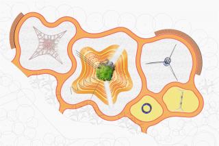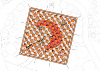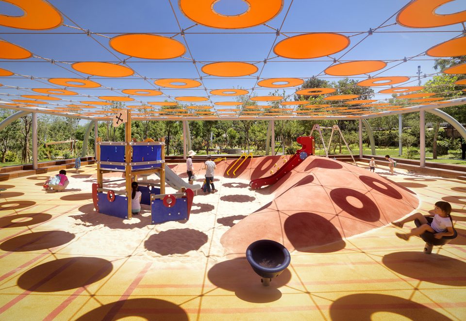 第一個游樂場的概念是針對低齡兒童,在公園內(nèi)創(chuàng)造一個游戲室一樣的空間。一個由明亮的橙色圓圈和甜甜圈組成的天幕作為遮陽傘,在“房間”的地形上投下俏皮的陰影。孩子們從兩級大木凳上走下來進入游戲區(qū),進一步為孩子們和家長們創(chuàng)造了一種圍合感和安全感。條紋狀的橡膠 "地毯 "創(chuàng)造了一個柔軟、安全的地面。孩子們可以從多種游戲設(shè)備中選擇,也可以在月牙形的小山丘和沙坑上發(fā)明他們自己的游玩方法。