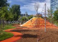 The concept for the first playground, aimed at younger children, is to create a playroom within the park space. A canopy of bright orange circles and donut acts as a sunshade and casts playful shadows across the topography of the room. Kids enter the play area by stepping down two large wood benches, which further create a sense of enclosure and security for both the and their supervisors. A pinstripe rubber ‘carpet’ creates a soft and forgiving floor. Children can choose from a multiplicity of play equipment or invent their own games on the crescent-shaped hill and sandpit.