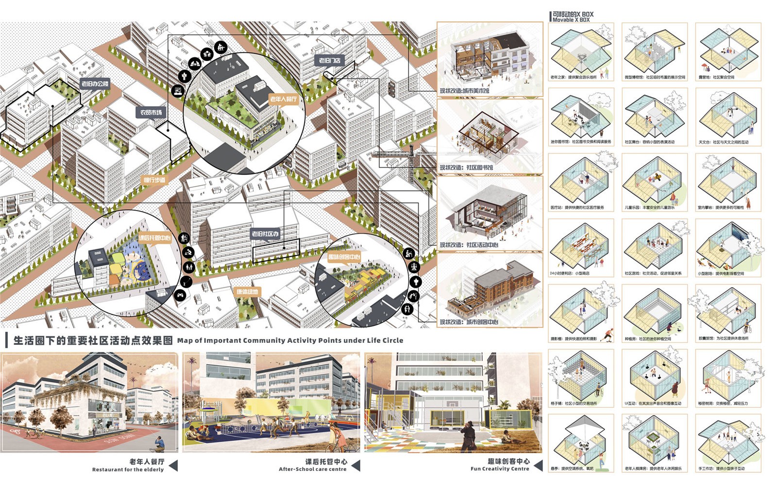 由于明城區(qū)內(nèi)存在大量利用率低的的老舊社區(qū)建筑,通過(guò)建筑空間功能置換,提升文化精神場(chǎng)所品質(zhì)是既是豐富明城區(qū)居民多元生活需求的關(guān)鍵,也是加強(qiáng)城市共享理念下社區(qū)鄰里關(guān)系交往和互動(dòng)的介質(zhì),通過(guò)創(chuàng)客中心、文化集市、迷你圖書(shū)亭、微型博物館等趣味感的設(shè)施參與,進(jìn)一步完善社區(qū)生活圈的文化資源配置,營(yíng)造更具有鄰里關(guān)系歸屬感的人文環(huán)境。