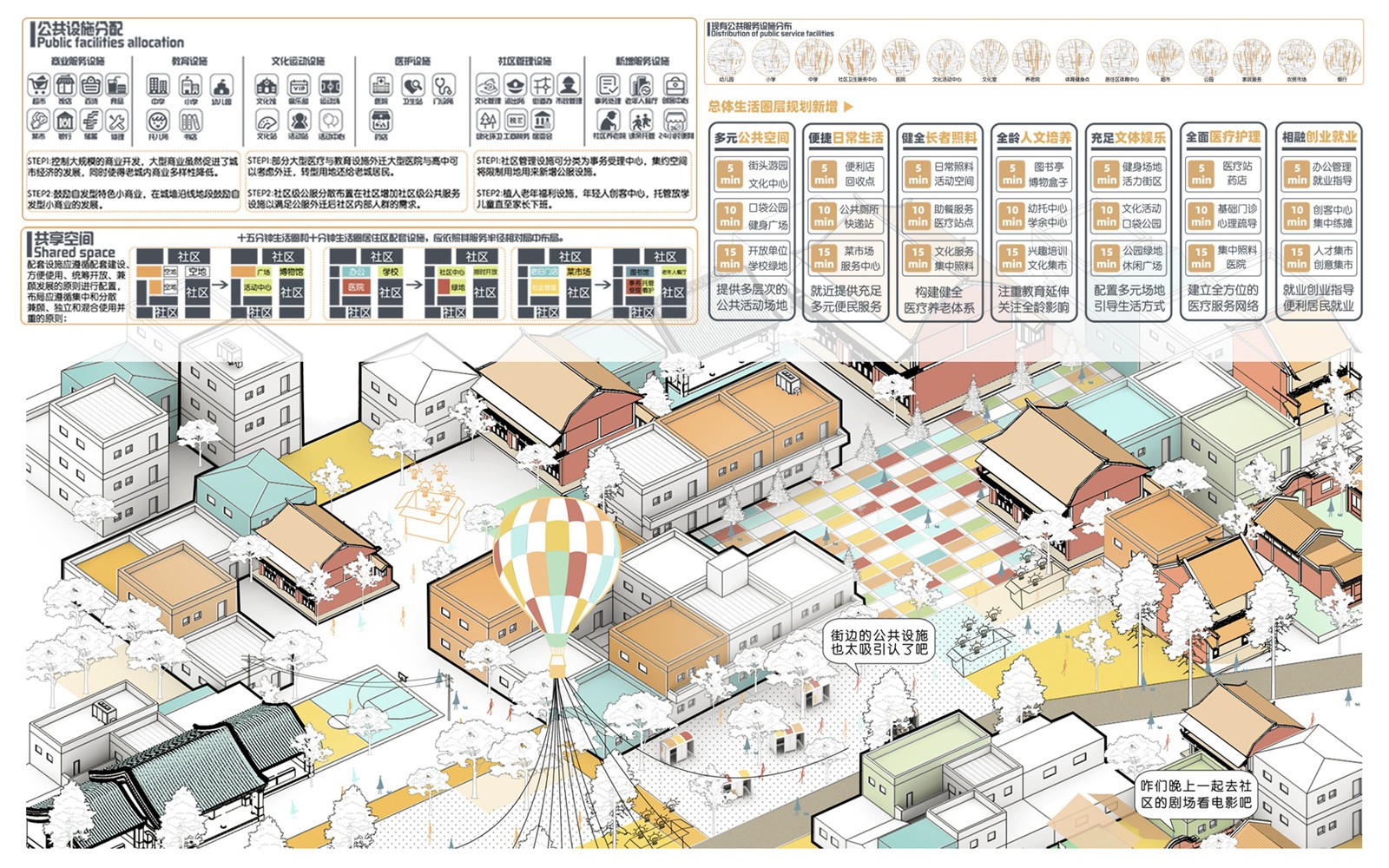 ▲通過(guò)完善5~15mins步行可達(dá)范圍內(nèi)健全與居民日常生活關(guān)系最為密切的七個(gè)方面公共服務(wù)設(shè)施新增,來(lái)取得共享城市資源之間的互補(bǔ)平衡。