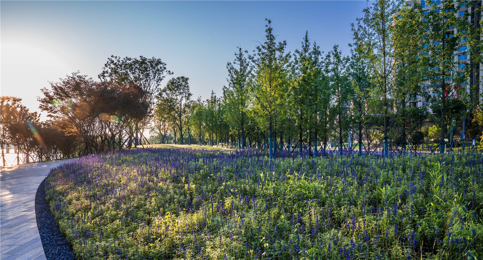 金霞濱水碼頭以北,沿線布置了老人活動場、高端餐飲、櫻花大道、浪漫花田和多功能大草坪等節(jié)點。