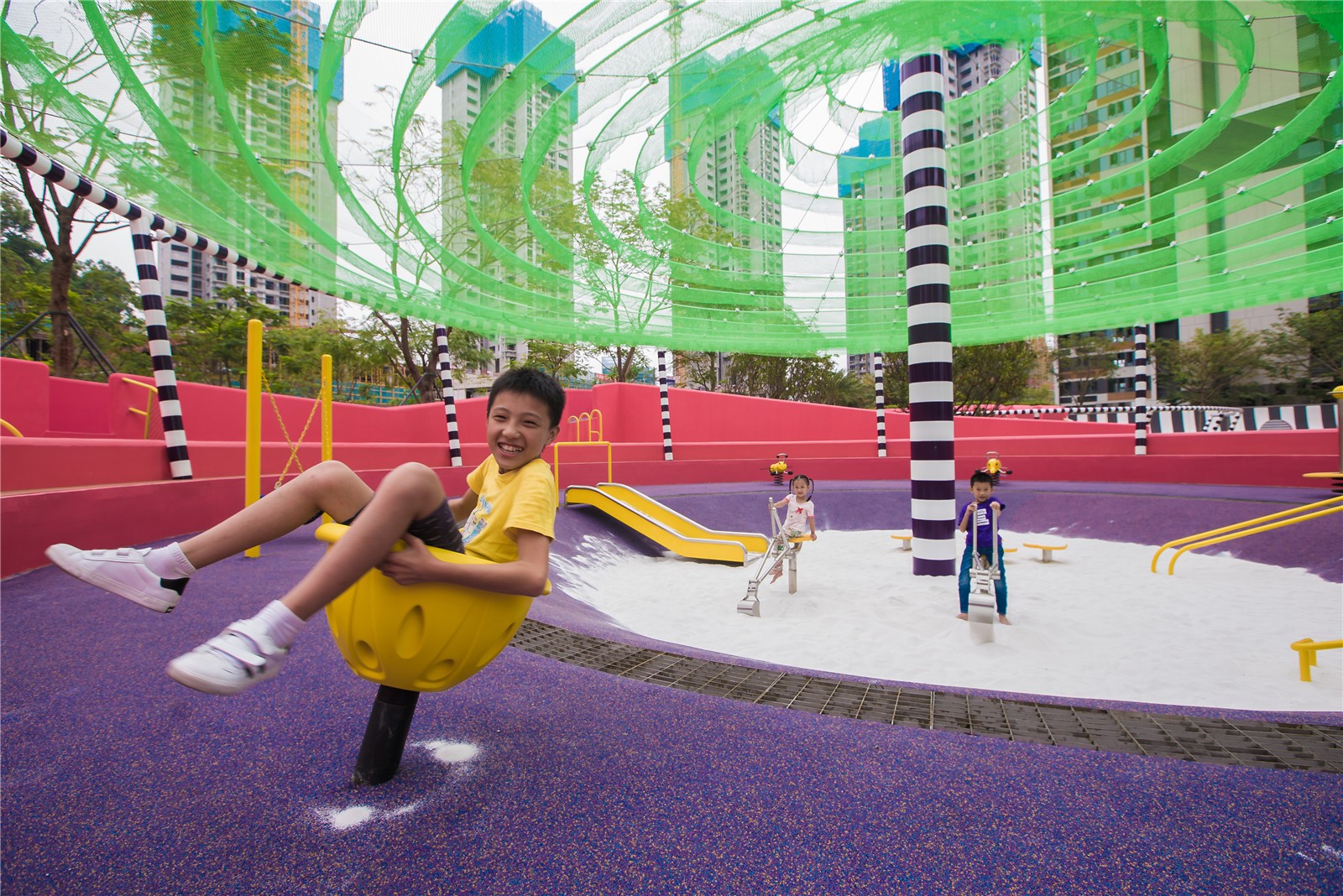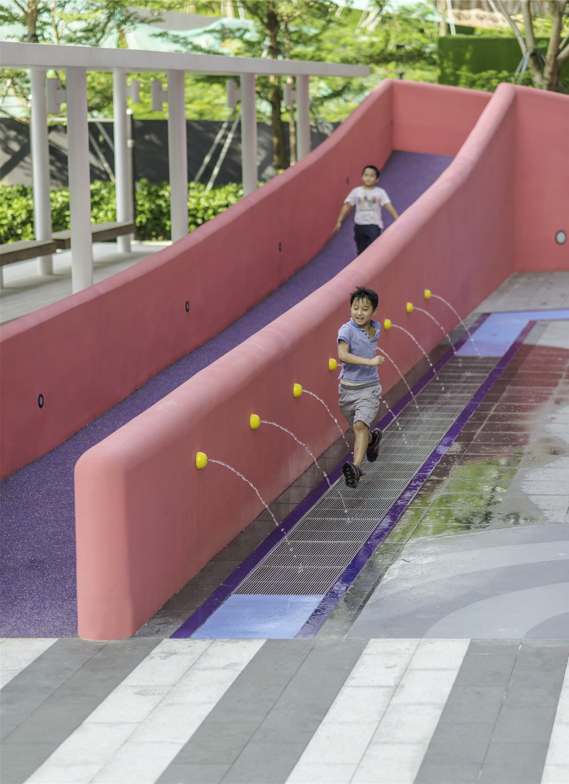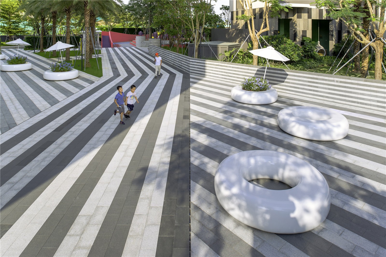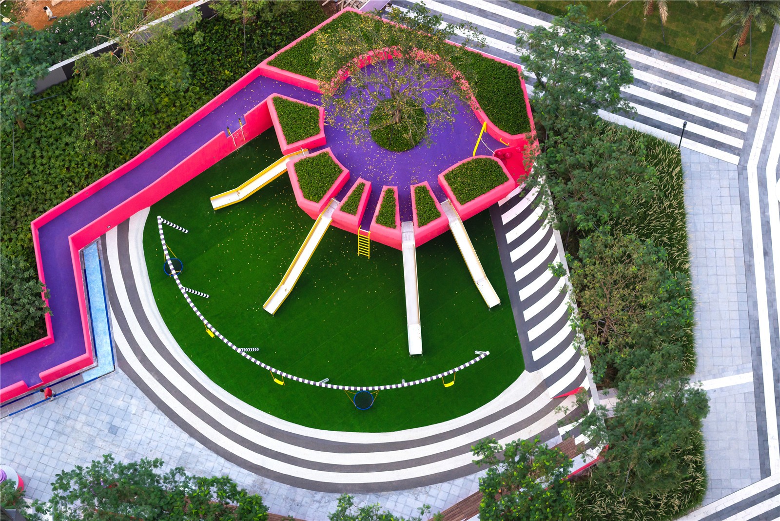 The playground at the center of the development is a constructed testament to the experimental nature of not only Shenzhen as a city, but its inhabitants. The mere existence of such an explosive gesture of planting, patterning, color, and materials which has become so quickly absorbed into the culture as common place, typical, or even generic, is a true testament to Shenzhen’s progressive nature and rapid future-oriented development.