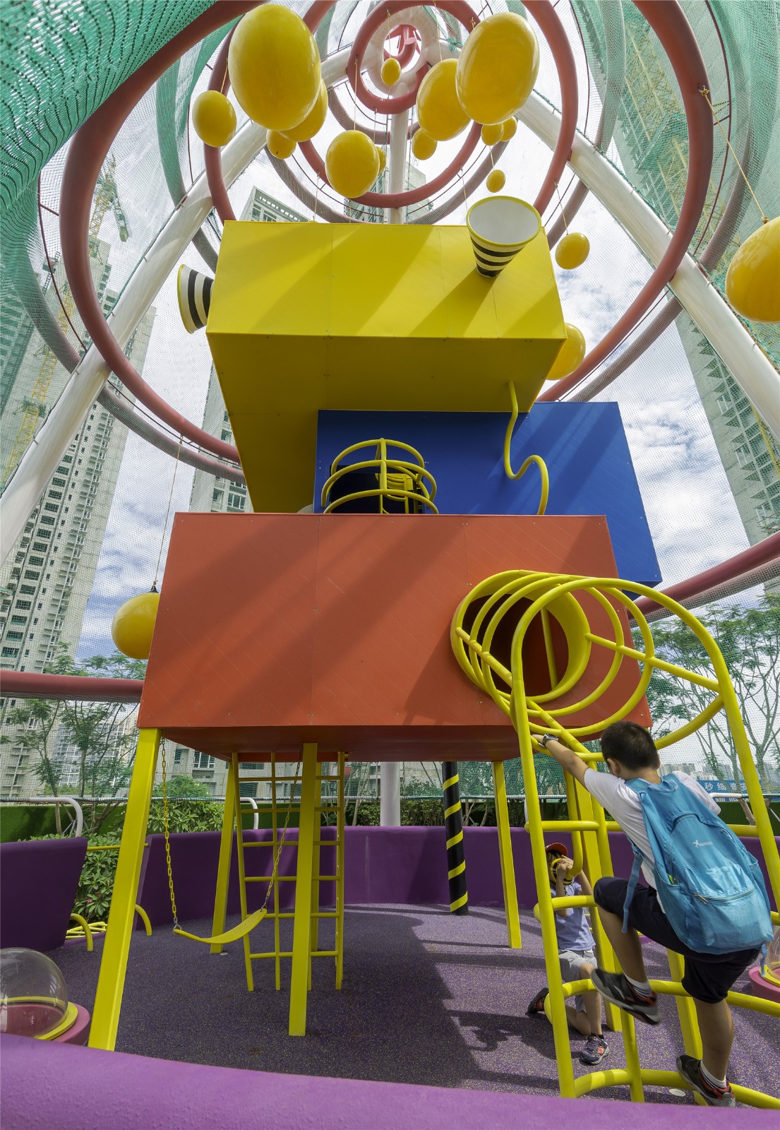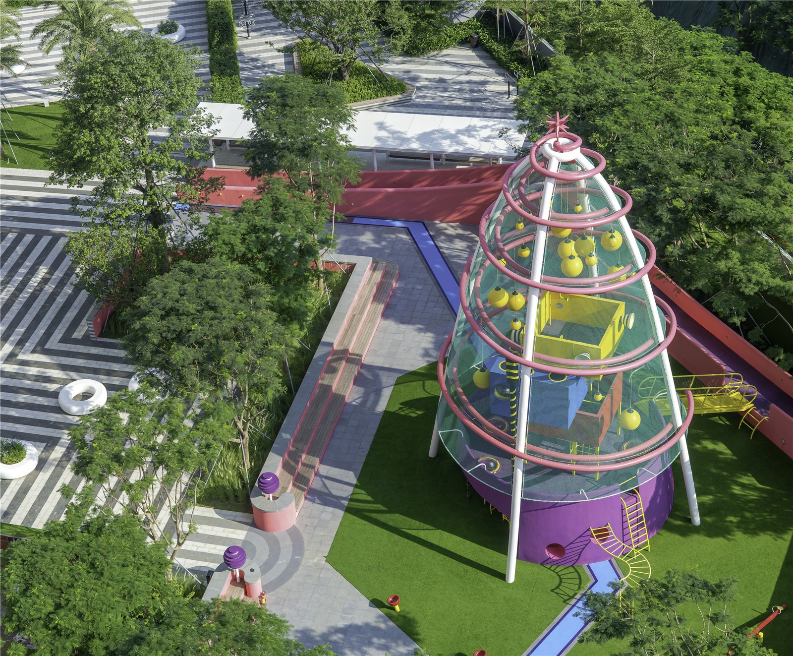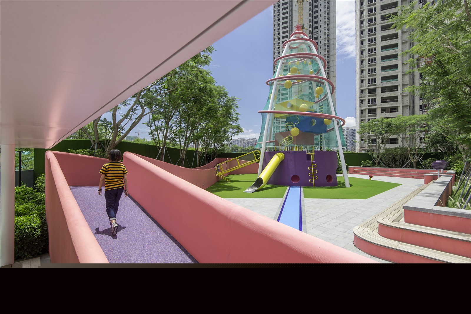 位于項(xiàng)目中心的游樂場(chǎng)的不僅是深圳這個(gè)城市的實(shí)驗(yàn)性質(zhì)的證明,也是深圳居民的實(shí)驗(yàn)性質(zhì)的證明。這種由植物、圖案、色彩和材料構(gòu)成的爆炸性的姿態(tài),如此迅速地被文化所吸收,成為常見的、典型的,甚至是通用的,這就是深圳進(jìn)步的本質(zhì)和面向未來的快速發(fā)展的真實(shí)證明。