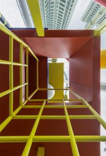 裙樓層面的景觀被必要的消防車道不經(jīng)意地切成兩半。BAM將這一元素改變成曲折的道路,通過明亮鮮艷的圖案來偽裝行車道,從而將兩邊聯(lián)系在一起。這條曲折的道路一方面是劃分場(chǎng)地的主要元素,也是將場(chǎng)地連接在一起的主要元素,同時(shí)還引導(dǎo)居民前往塔樓架空大廳的主要通道。