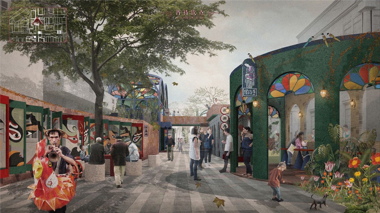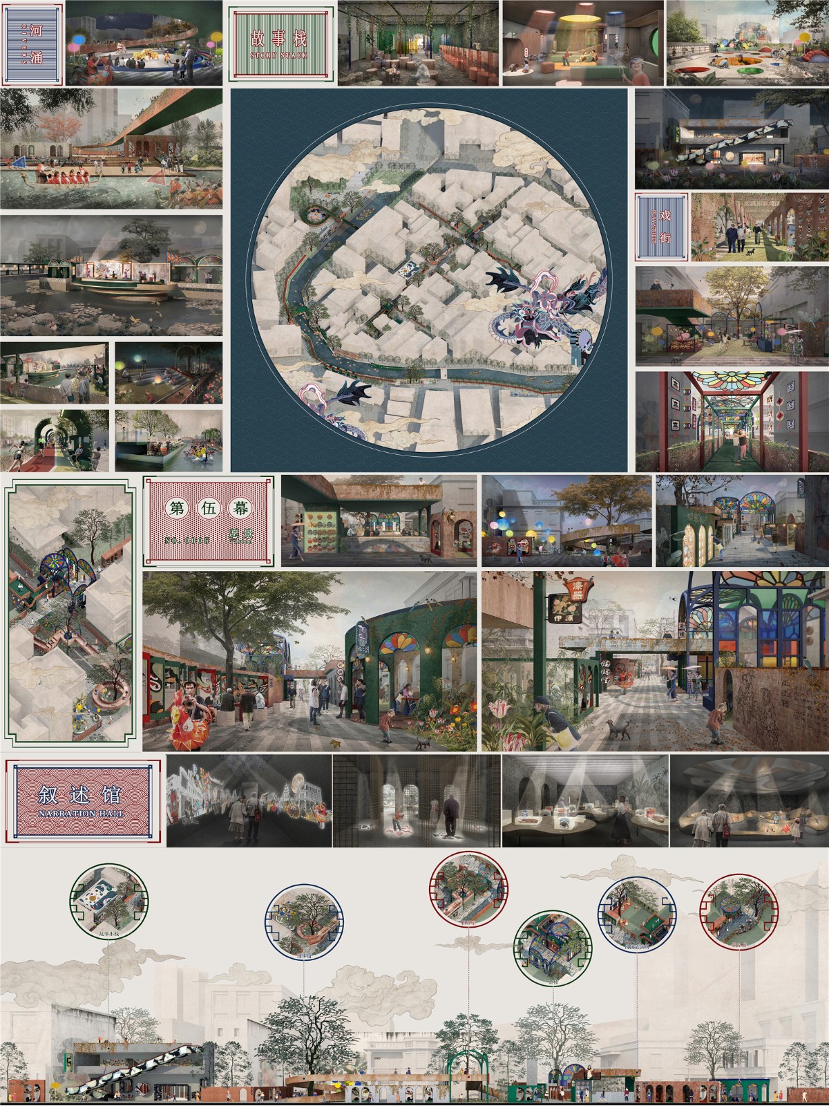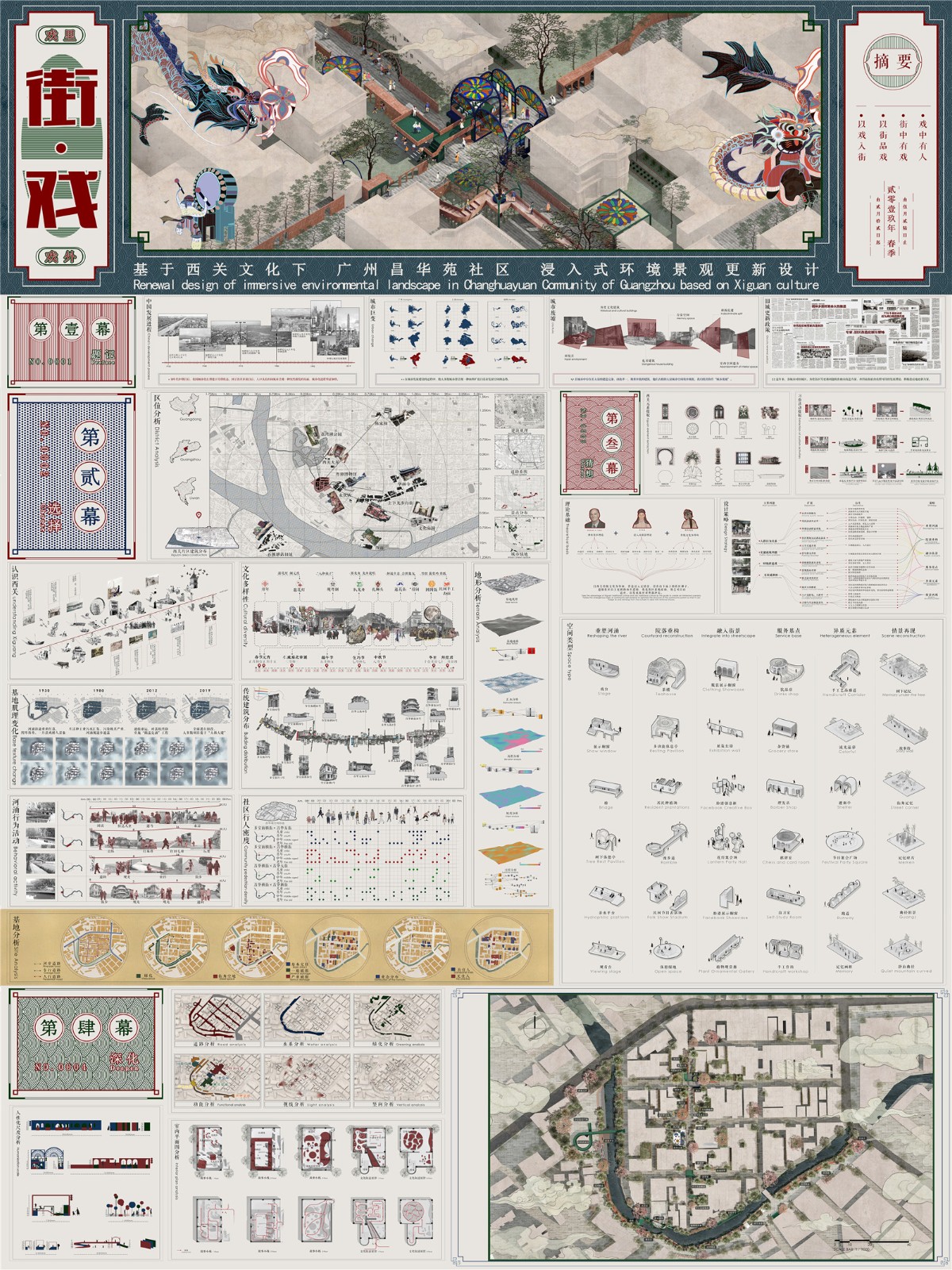 以西關(guān)傳統(tǒng)文化為切入點,通過重塑河涌、院落重構(gòu)、融入街景、服務(wù)基地、異質(zhì)元素、情景再現(xiàn)六個策略,以“戲”為主題,即童謠的戲、粵劇的戲、民俗的戲、行為活動的戲,對社區(qū)街道、建筑內(nèi)部空間及河涌公共空間功能進行重構(gòu),營造浸入式情景,讓過去的記憶或值得保留的文化在空間中不經(jīng)意間的發(fā)生,使其產(chǎn)生碰撞,使城市狂野的發(fā)展往理性的方向發(fā)展,喚醒居民自然的生活狀態(tài),重構(gòu)屬于這座城市自己的內(nèi)城。