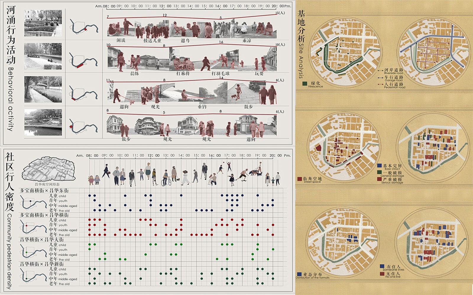 ▲我們通過前期場地調(diào)研,發(fā)現(xiàn)場地的綠地和街角空間呈碎片化分布,且社區(qū)業(yè)態(tài)無法滿足社區(qū)生活需求。由于社區(qū)公共空間狹小,導(dǎo)致居民日常活動主要在河涌進行。且活動形式單一。在社區(qū)路口的行人密度分析中,發(fā)現(xiàn)昌華橫街雖然離社區(qū)核心居住區(qū)較遠(yuǎn),但行人密度較大,且分布大量的院落空間,是一個有價值的社區(qū)失落空間