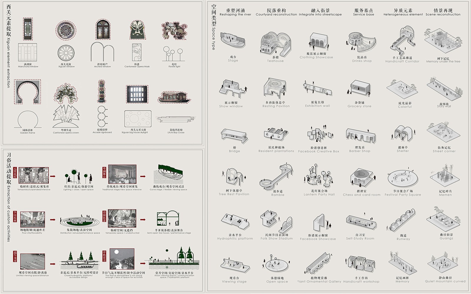 ▲我們提取了西關(guān)十大元素作為基礎(chǔ)的設(shè)計形態(tài),并通過總結(jié)西關(guān)習(xí)俗活動的特性設(shè)定空間類型綜上所示,我們推導(dǎo)出了36個空間類型