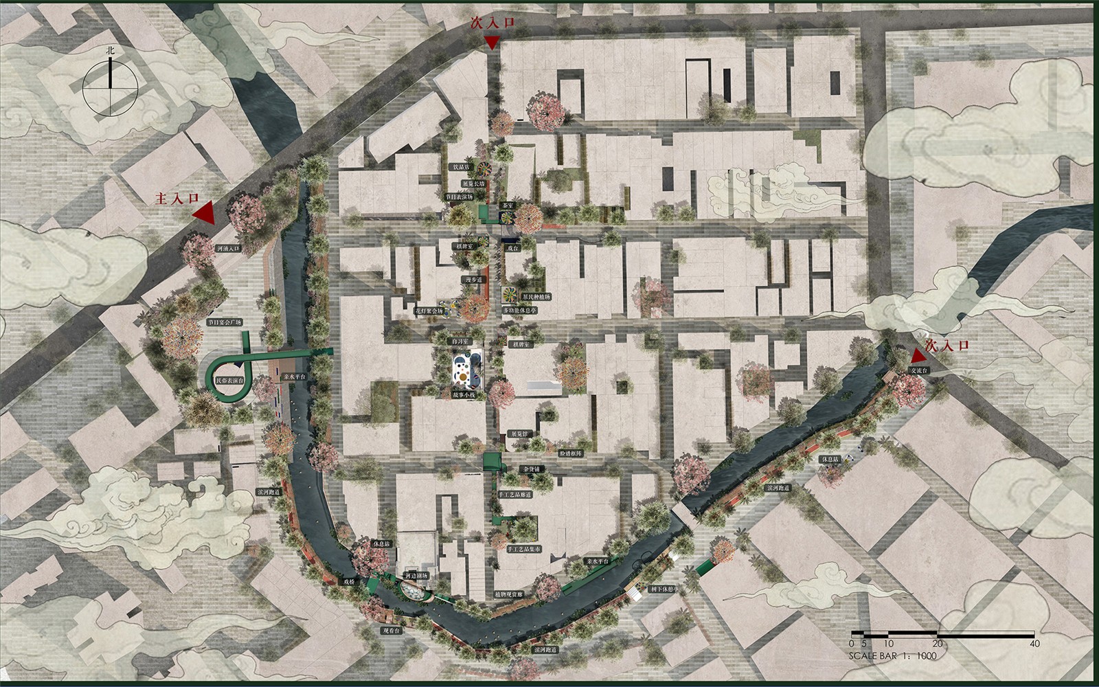 ▲這是方案的總平面圖,我們主要以“戲”為主題來活化這條街道及河涌空間,一方面以商業(yè)和文化因素吸引更多外來人群,另一方面也能部分滿足社區(qū)居民日?;顒有枨?。主要設(shè)計內(nèi)容包括街區(qū)景觀、院落文化空間、街角休閑空間、河涌濱水景觀等,還包括兩處建筑空間改造,分別是故事棧和敘述館。右邊這一片是社區(qū)主要生活區(qū)域,作品后續(xù)繼續(xù)推進的話,對這部分會針對居民日常做更多的微更新改造。