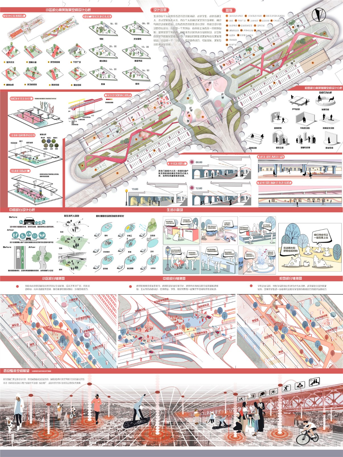 此次在高架橋的附屬空間設(shè)計中,將居民們的生活文化與高校文化相結(jié)合,融成一個”小城“,體現(xiàn)城市活力、社區(qū)溫暖、文化互融的多元化空間。生活中每個人都擔(dān)任著各種角色,或是學(xué)生,或是普通工人,亦或是退休老人等,而每個人的角色又是不停變換的,角色與角色之間的碰撞,會有各種各樣的生活小場景,而此次設(shè)計的場地中心部分,就猶如一個大舞臺,每天都上演著不一樣的故事,如果你是個旁觀者,那你便不會厭倦這真實(shí)的故事。