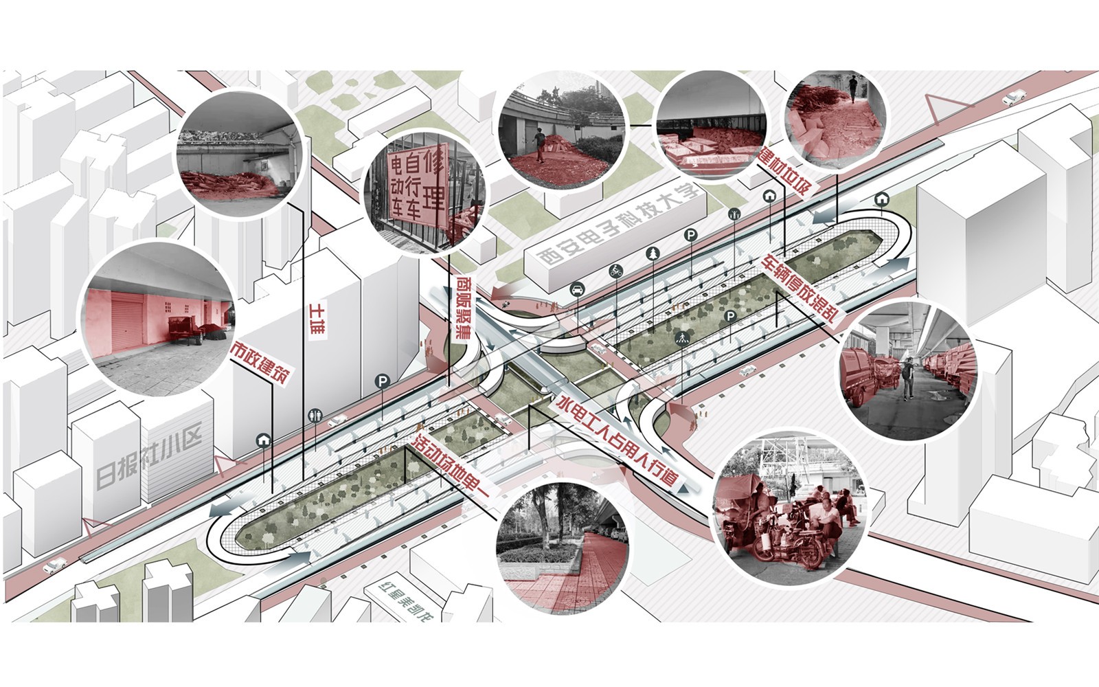 前期分析:前期主要為問題現(xiàn)狀的分析,先將整個高架橋的發(fā)展介紹,再針對太白路立交橋的現(xiàn)狀問題進(jìn)行分析。因其臨學(xué)校以及小區(qū)的特殊區(qū)位,在分析的時候?qū)⑵浞殖扇齻€部分去分析。分為學(xué)校部分現(xiàn)狀分析、中間部分現(xiàn)狀分析和小區(qū)部分現(xiàn)狀。每個部分針對三個最主要的問題進(jìn)行分析。將場地的物理環(huán)境和人的參與行為等進(jìn)行重點(diǎn)分析。