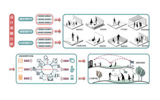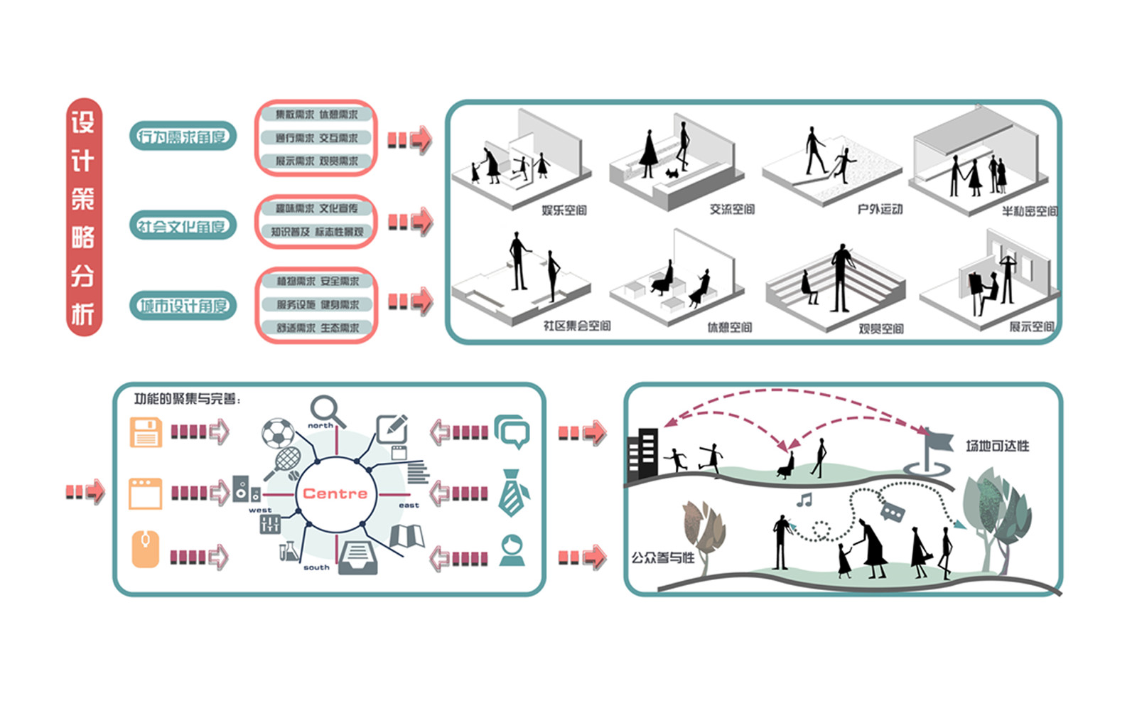 設(shè)計策略:針對三塊三個不同的點(diǎn)去設(shè)計,在行為需求角度、社會文化角度、城市設(shè)計角度進(jìn)行分析,將其功能進(jìn)行完善和聚集,提高場地可達(dá)性和公眾參與性。