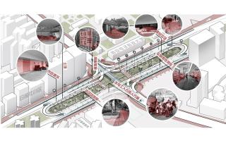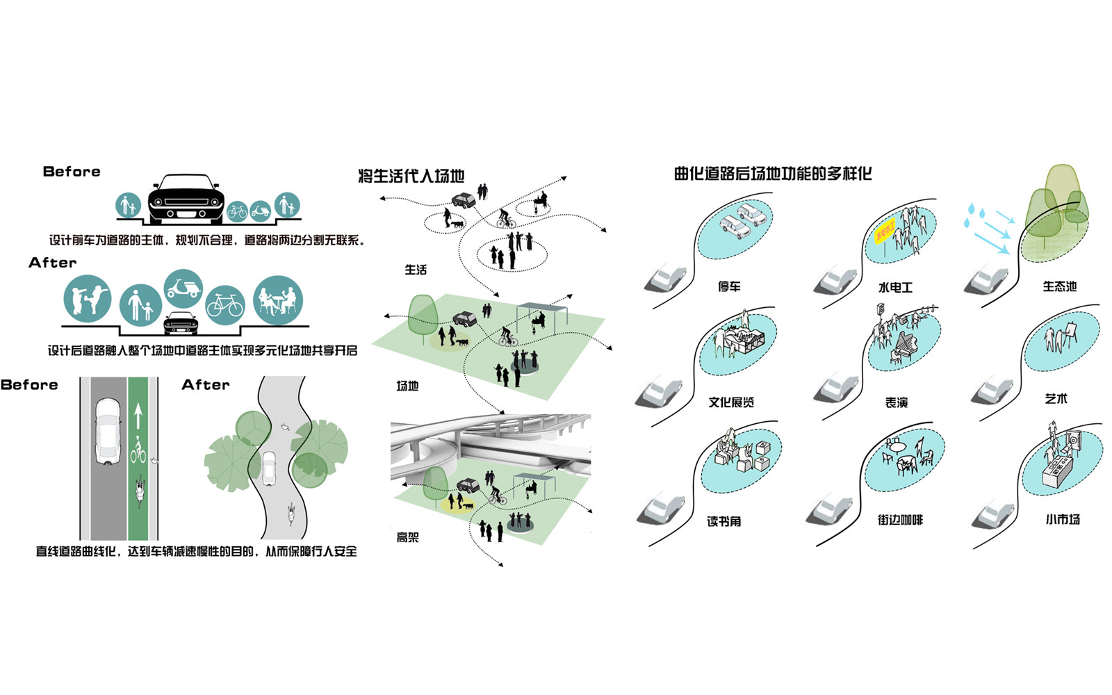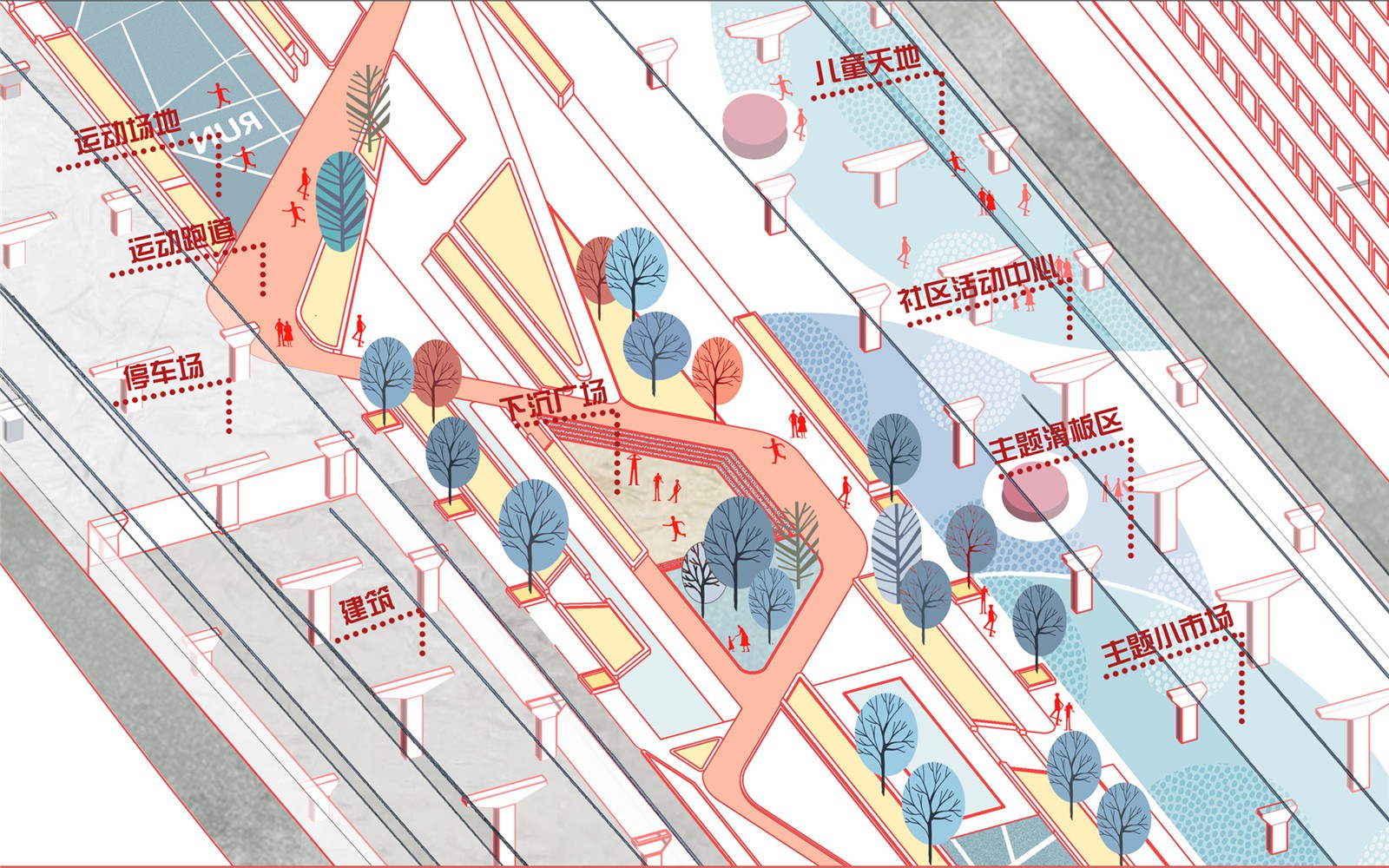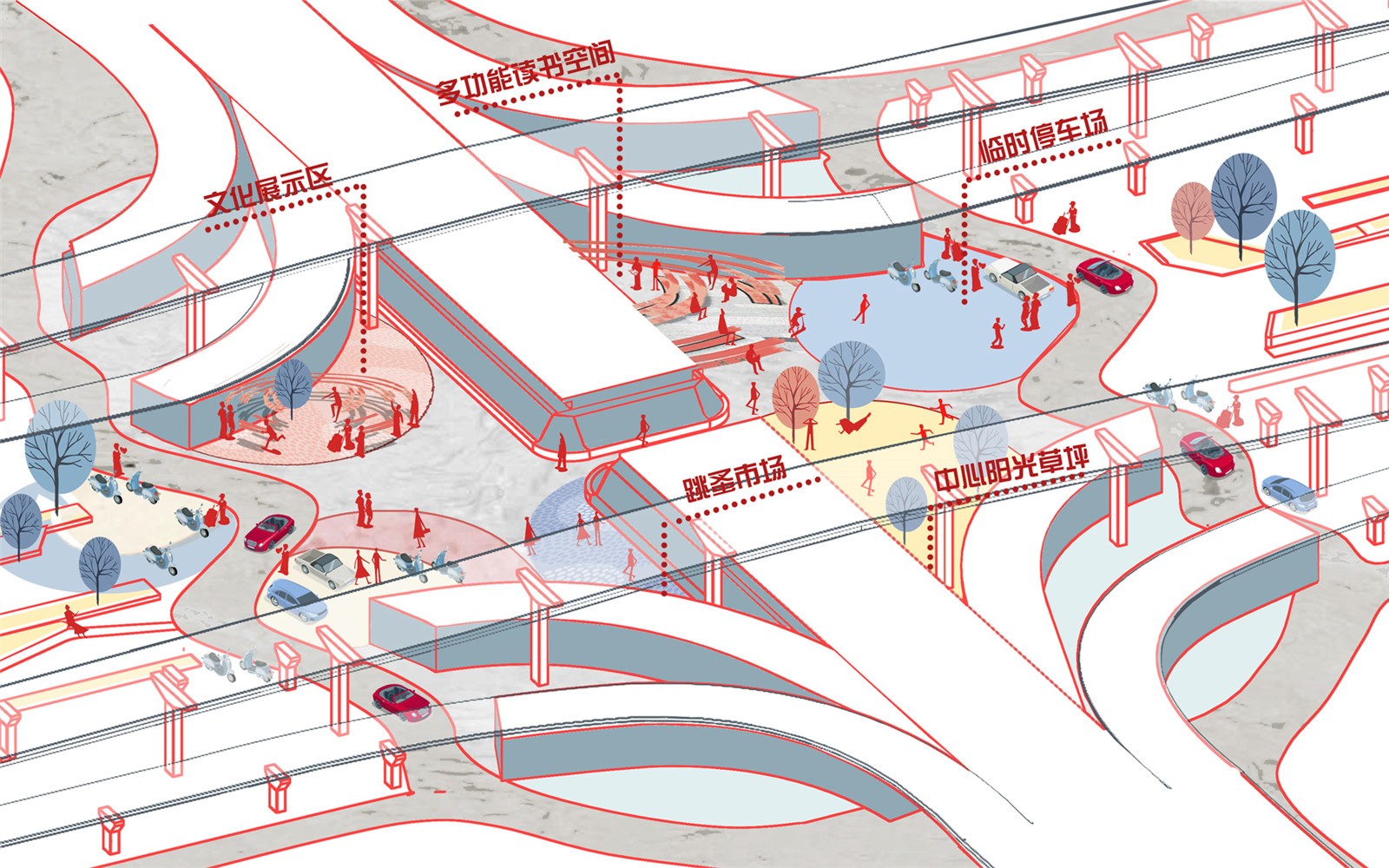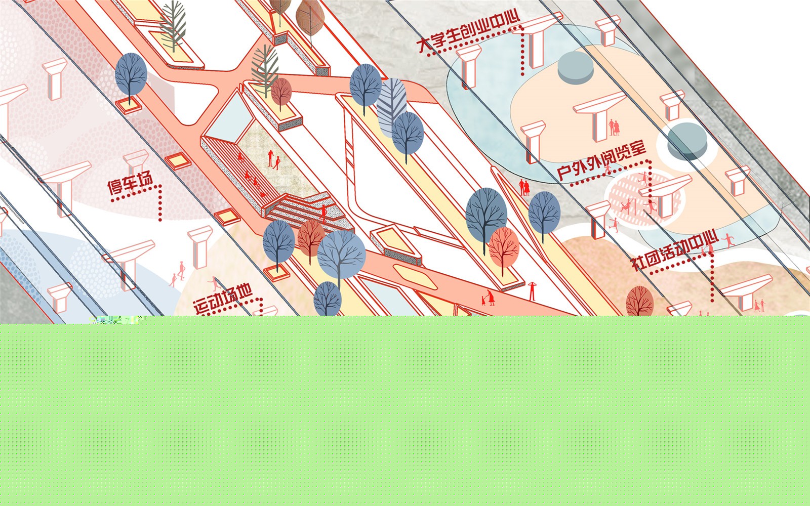 其中不同的人群和不同的場地之中的相互關(guān)系,使得整體呈現(xiàn)出“小城大愛”的場地效果,演繹了一個個不同的故事,形成這個故事匯,一個高架空間的設(shè)計可以當(dāng)作整個城市高價空間的范例,以此帶動整個城市高架橋空間的活力。