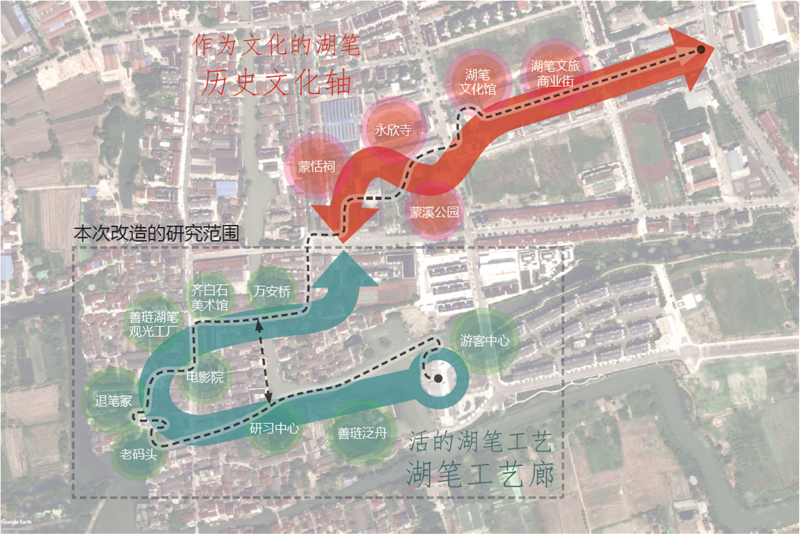 善璉鎮(zhèn)是湖筆發(fā)源地,同時也是湖筆制作和工藝重鎮(zhèn),我們從更大尺度上將本案區(qū)域和歷史文化景點軸線進行聯(lián)通并區(qū)分定位:湖筆工藝廊和歷史文化軸。