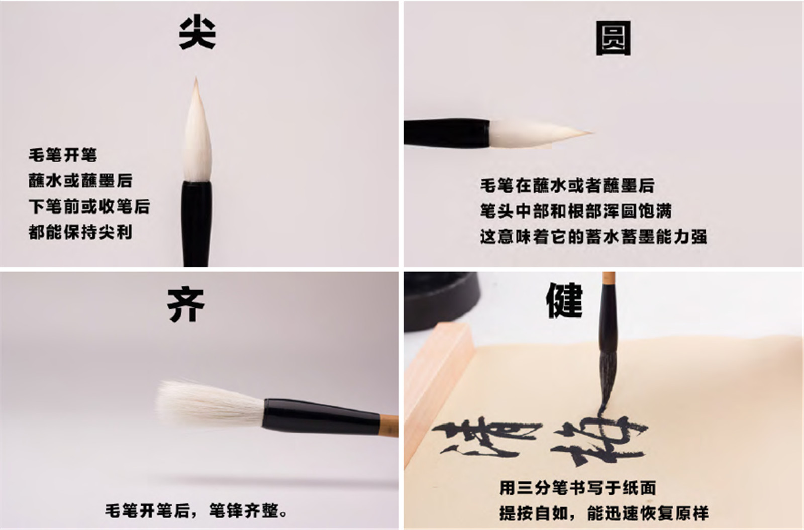 The Hu writing brush is famous as “Hu Ying” and has four excellent characteristics:“Shaped”means keeping the edge of the writing brush sharp;“Round”means that the writing brush keeps ink well;“Neat”means a neat beginning of a brushstroke;“Strong”means that the writing brush has moderate toughness.In fact, Shanlian town has making writing brushes for generations, and the four characteristics of the Hu writing brush have been integrated into this town`s character:“Pointed”is a sign of persistence; “Round”is a sign of accumulating; “Neat”is a sign of meticulosity; “Strong”means that the stronger the pressure, the tougher it is.