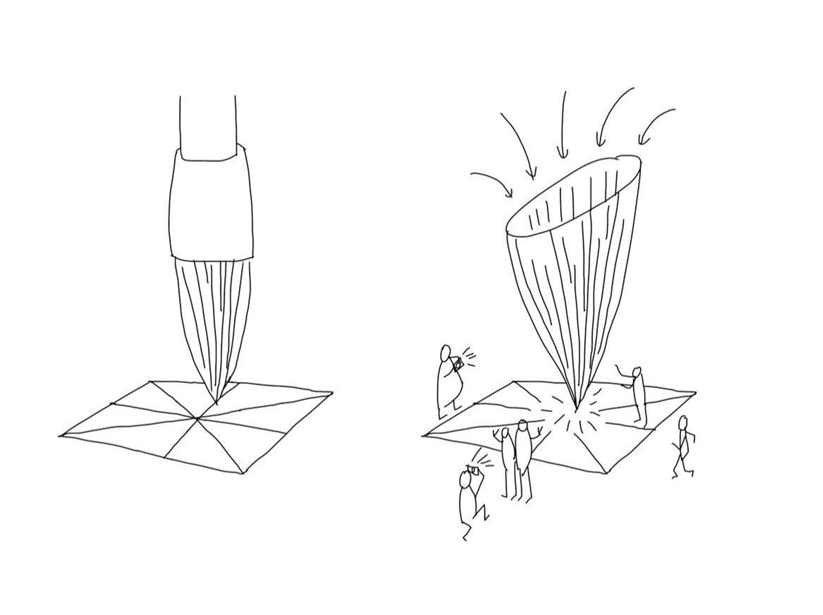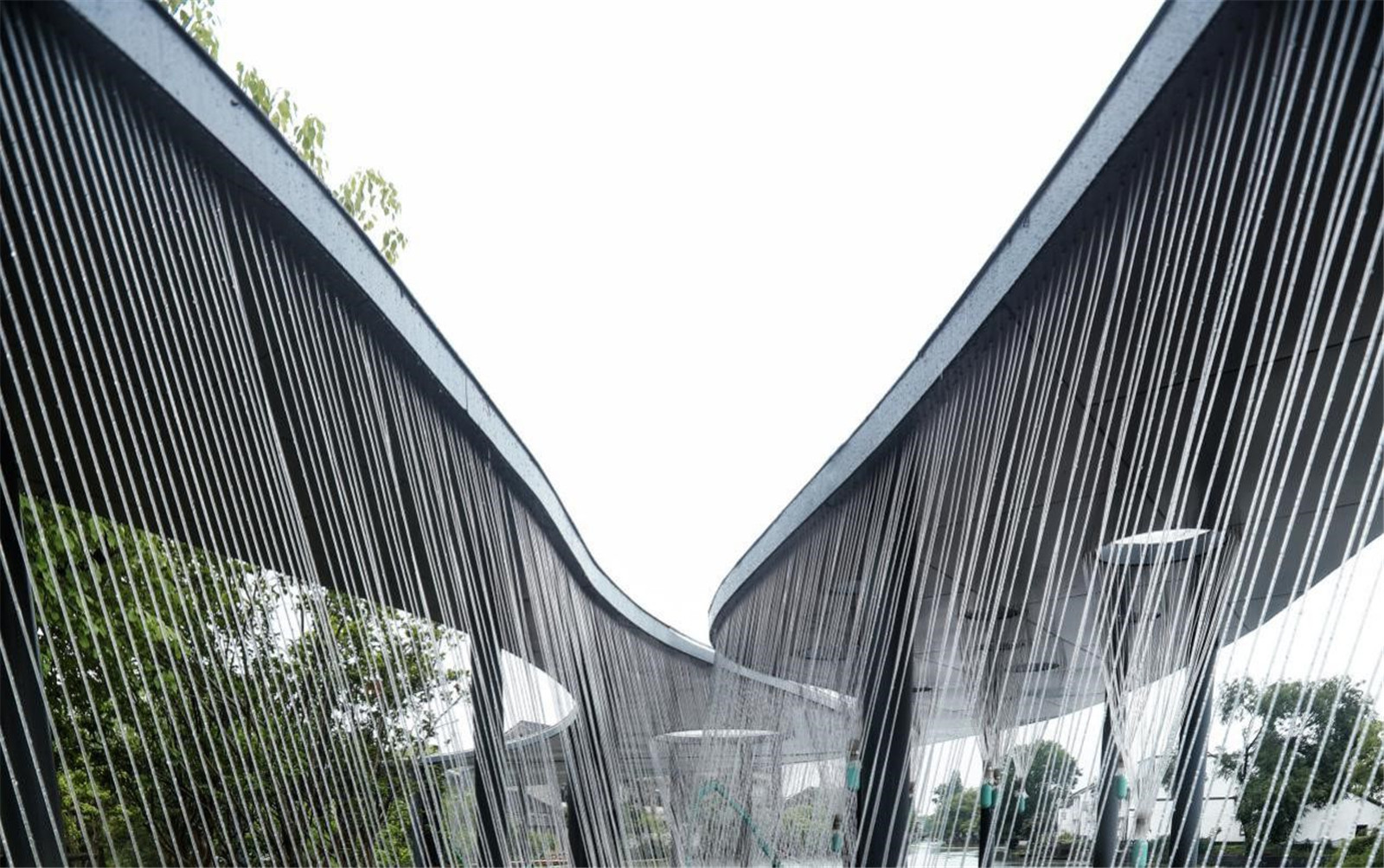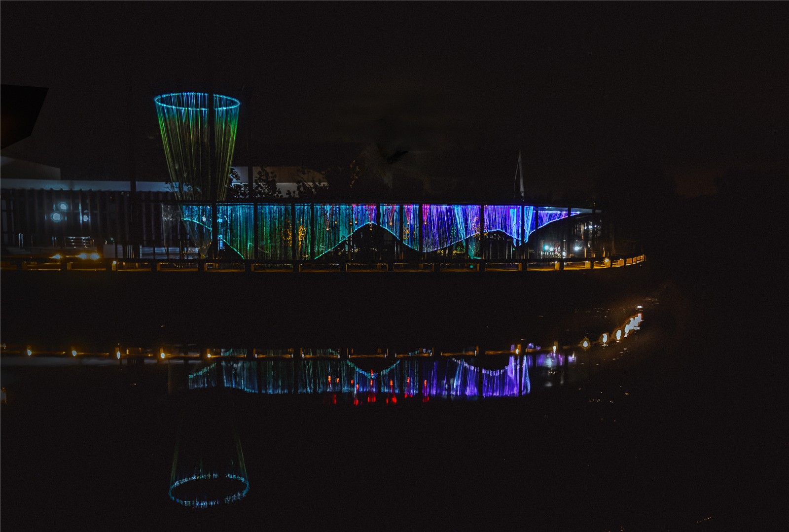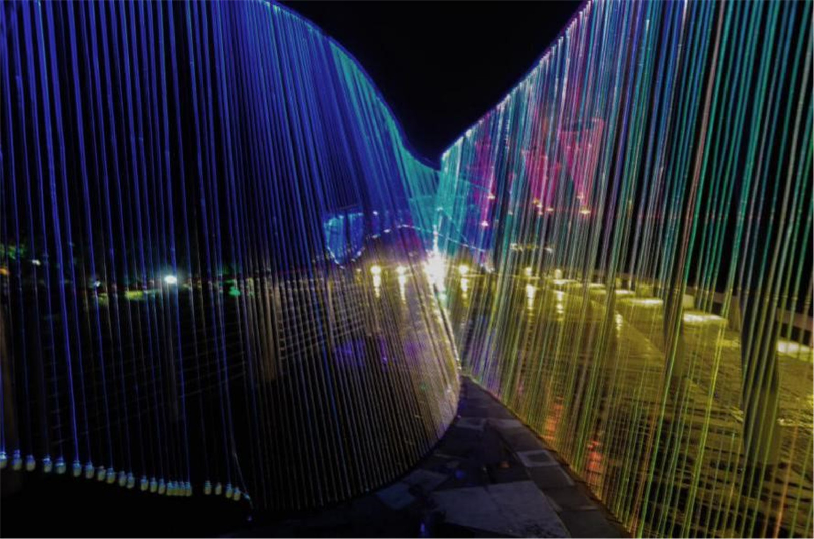 充盈了光線,隨風(fēng)飄蕩的筆尖藝術(shù)裝置。燈光設(shè)計中利用光導(dǎo)纖維一端攝入燈光點亮整條光纖的手法,并通過燈光控制程序進行動態(tài)效果的營造,豐富夜間燈光體驗。