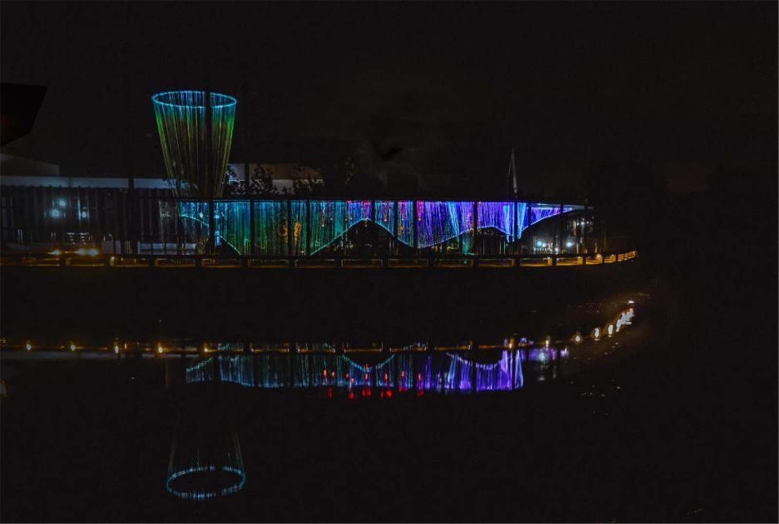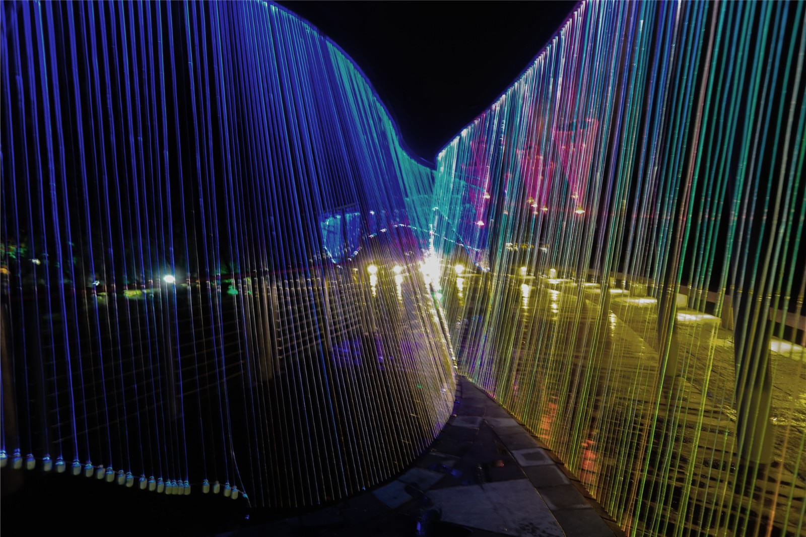 An art installation filled with light and floating in the wind. In addition to lighting the whole optical fiber by taking in light at one end of the optical fiber, we also use Light control program to create projection animation effect on the optical fiber curtain to enrich the night lighting experience.
