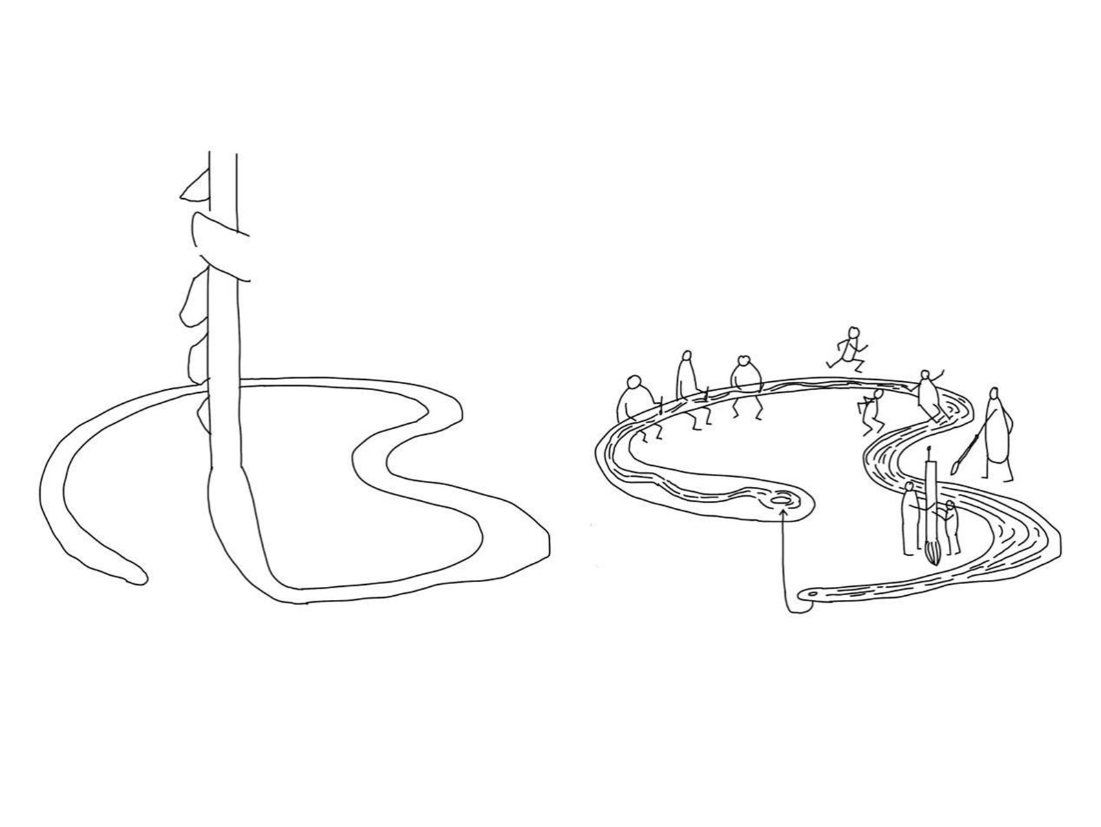 由立體水環(huán)串聯(lián)起的,參與性強的書法練筆公園。湖筆發(fā)源于善璉,其發(fā)展歷史源遠流長。此方案由硯臺水源象征善璉,各個奇石象征各大湖筆途徑城市。用水槽將他們相連,流水潺潺而下,以景觀的方式,闡述湖筆發(fā)源的歷史。
