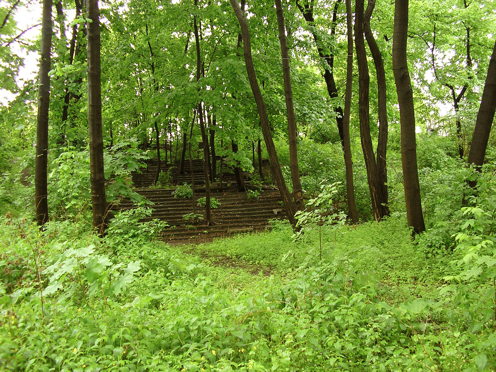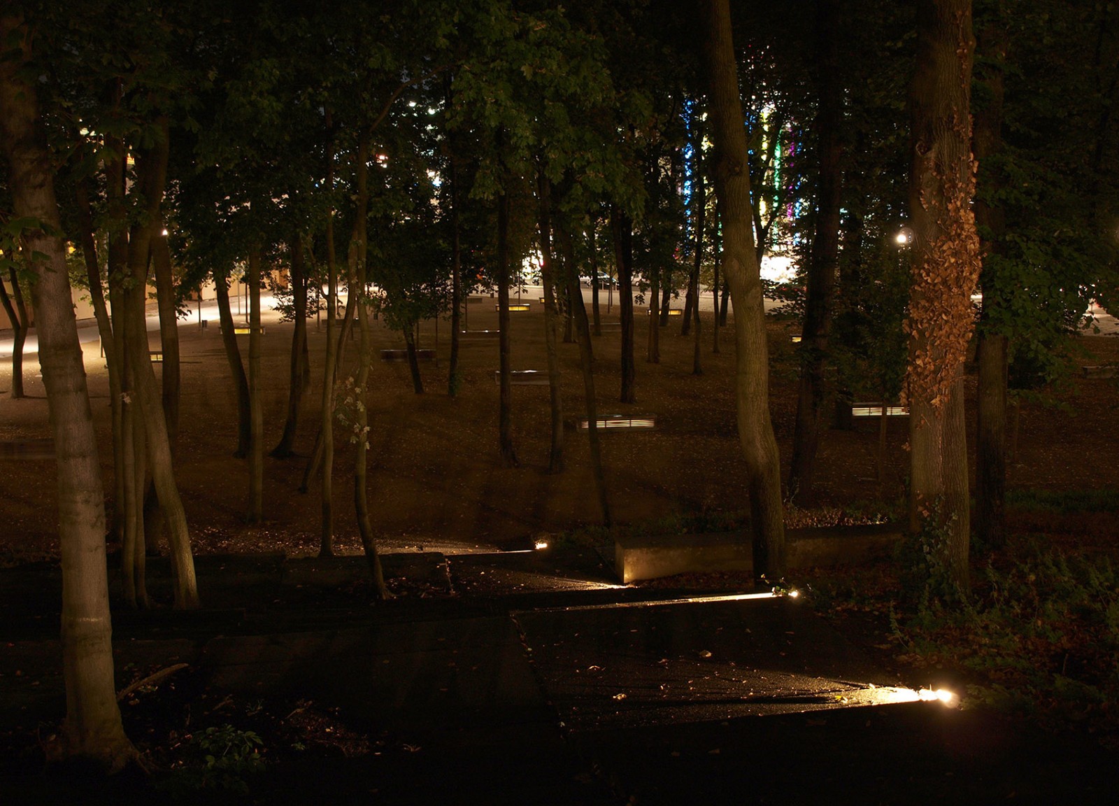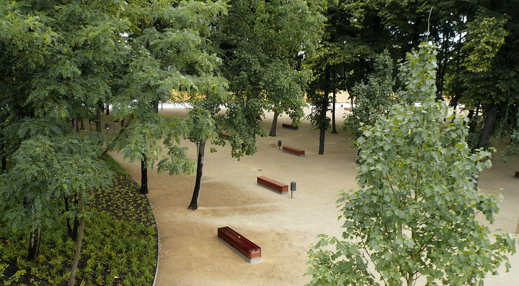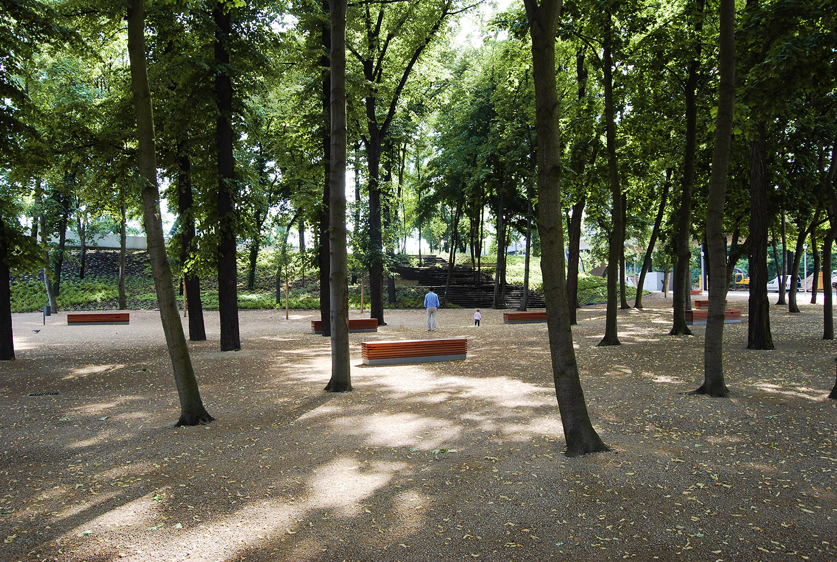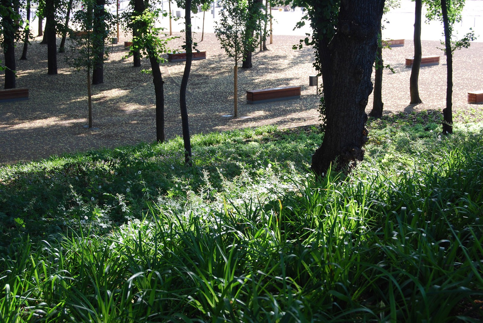廣場(chǎng)東面為流暢明快的硬質(zhì)鋪裝通道,核心部分則保留為綠地。為保證通行性,雜亂的底層植被被拔除。大量被保留及新種植的樹(shù)木充實(shí)了綠地的框架。這既留存了場(chǎng)地郁郁蔥蔥的特點(diǎn),又用樹(shù)冠構(gòu)筑出新的“屋頂”,用于紀(jì)念被炸毀的展覽館。