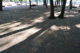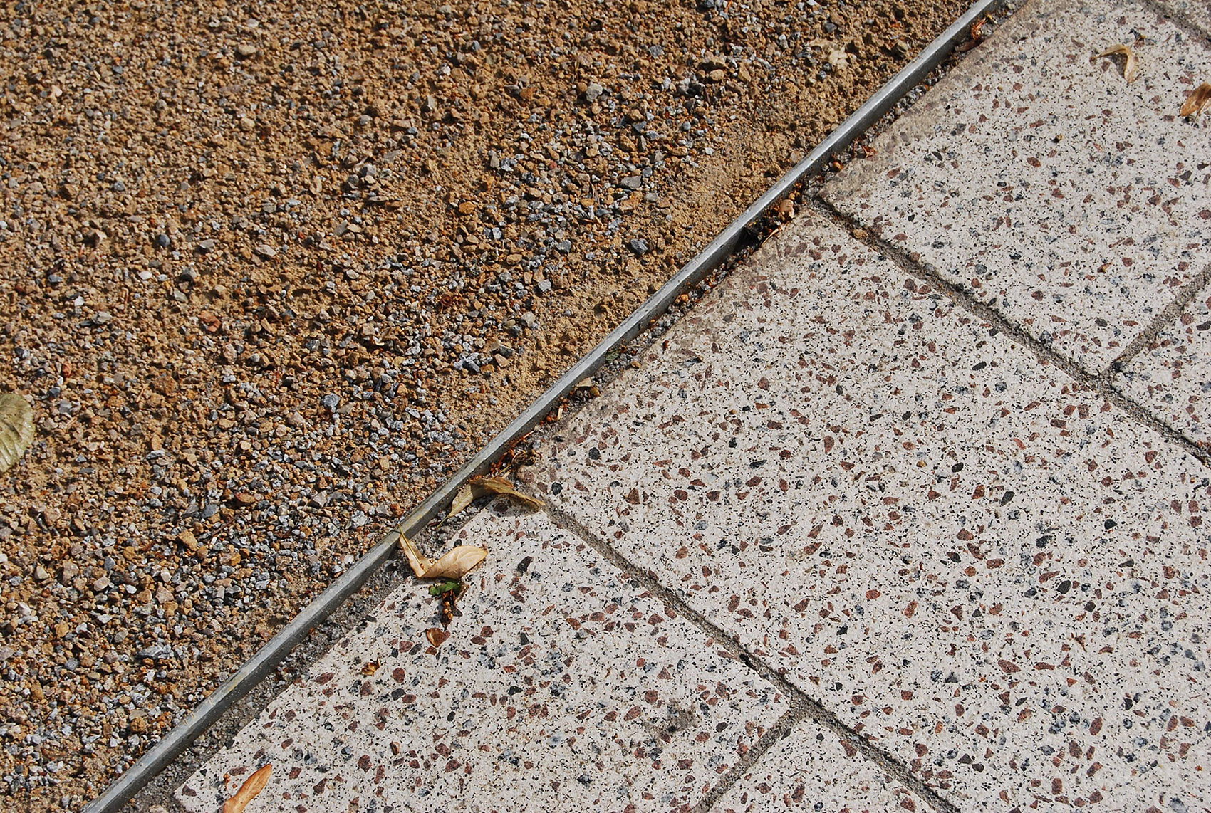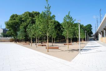 硬質(zhì)鋪裝與素土相接處,用鋼條隔開(kāi),并整理出較平坦的地形,保持場(chǎng)地的整體性。核心素土鋪面既與硬質(zhì)鋪裝柔和過(guò)渡,又方便種植樹(shù)木,還能更有效吸收雨水,實(shí)現(xiàn)場(chǎng)地內(nèi)雨水收支平衡。綠地內(nèi)部樹(shù)木的生長(zhǎng)使地表微微隆起,這些不影響通行的地形變化都被保留。特別定制的鋪裝石板上,分散著與素土顏色一致的石粒。被行人帶到硬質(zhì)鋪裝上的素土融入鋪裝,保持視覺(jué)上的整潔。
