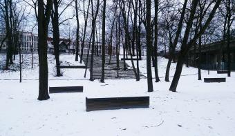 舍棄了座椅靠背及柱式照明的場(chǎng)地,展示出節(jié)制有序的韻律。木質(zhì)為面,水泥為底,座椅在材料上配合幽靜的環(huán)境,在功能上給燈光設(shè)備提供藏身之所。柔和的燈光保證了夜間的安全性,又打造出與白天不同的寧?kù)o的場(chǎng)景。富有節(jié)奏感的設(shè)計(jì)讓場(chǎng)地在寒冬白雪中別有一番肅靜之美。