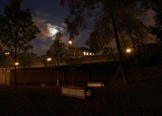 Abandoned the seat back and column lighting venues, showing the rhythm of restraint and order. The wood is the surface and the cement is the bottom. The material of the seat matches the quiet environment, and the function provides a hiding place for the lighting equipment. The soft lighting ensures the safety at night and creates a tranquil scene different from the daytime. The rhythmic design makes the venue unique in the cold winter and white snow.