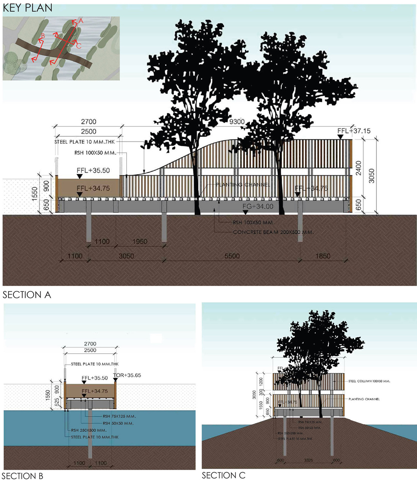 The name ‘Bird Wave’ tributes to its appearance as well as the surroundings in which it is situated, giving importance to the uses and function of the Bird Sanctuary and gently introducing the different kind of public green space where biodiversity can coexist with urban environment.