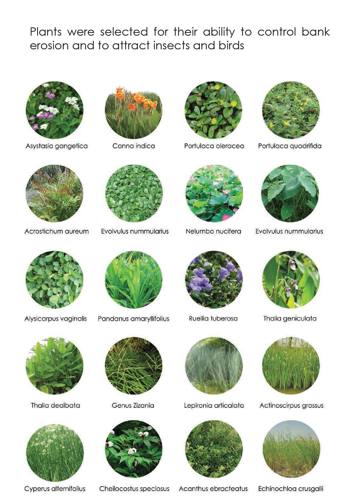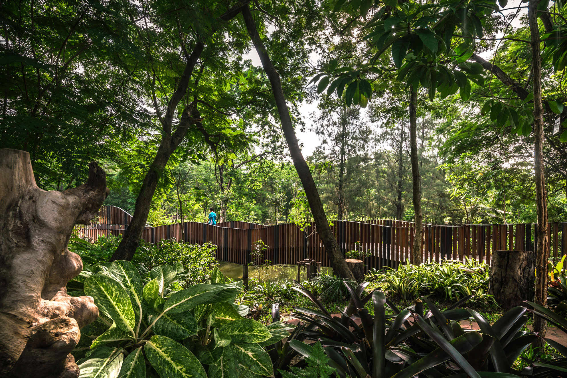 The bridge is primarily constructed with 3 materials; reinforced concrete for the footing and column, black painted steel for above ground structure and weathered timber for flooring and railing. The surrounding landscape which was affected by construction was re designed in consultation with The Bird Conservation Society of Thailand to increase suitable living condition for small animals, banks were gently sloped into the water to provide feeding and refuging environment and various flowering shrubs and trees were planted to protect slope and attract insects. The next step to fully complete the project is fund raising to provide interpretive signage.