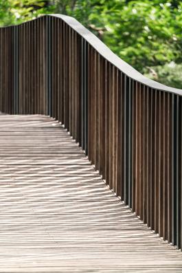 羽翼橋位于Queen公園中軸線的北端,橫穿分割兩個(gè)公園的小河道,蜿蜒穿越現(xiàn)有的樹林區(qū)域,另一端落于地勢(shì)低2m的Rotfai公園中。鳥翼橋波浪起伏的橋面也是為了緩和地勢(shì)的高度差而設(shè)計(jì)的,同時(shí)也是保存了Queen公園內(nèi)原有橋梁的形狀。橋梁中部橫跨鳥類保護(hù)區(qū),創(chuàng)造了一處以樹冠為屋頂?shù)膽敉饪臻g。由半實(shí)心的木欄圍合出了一個(gè)隱秘的觀鳥區(qū)。