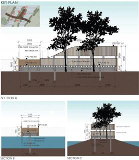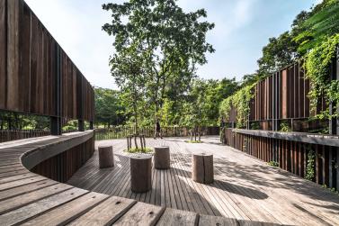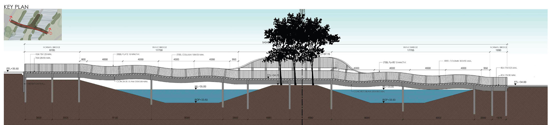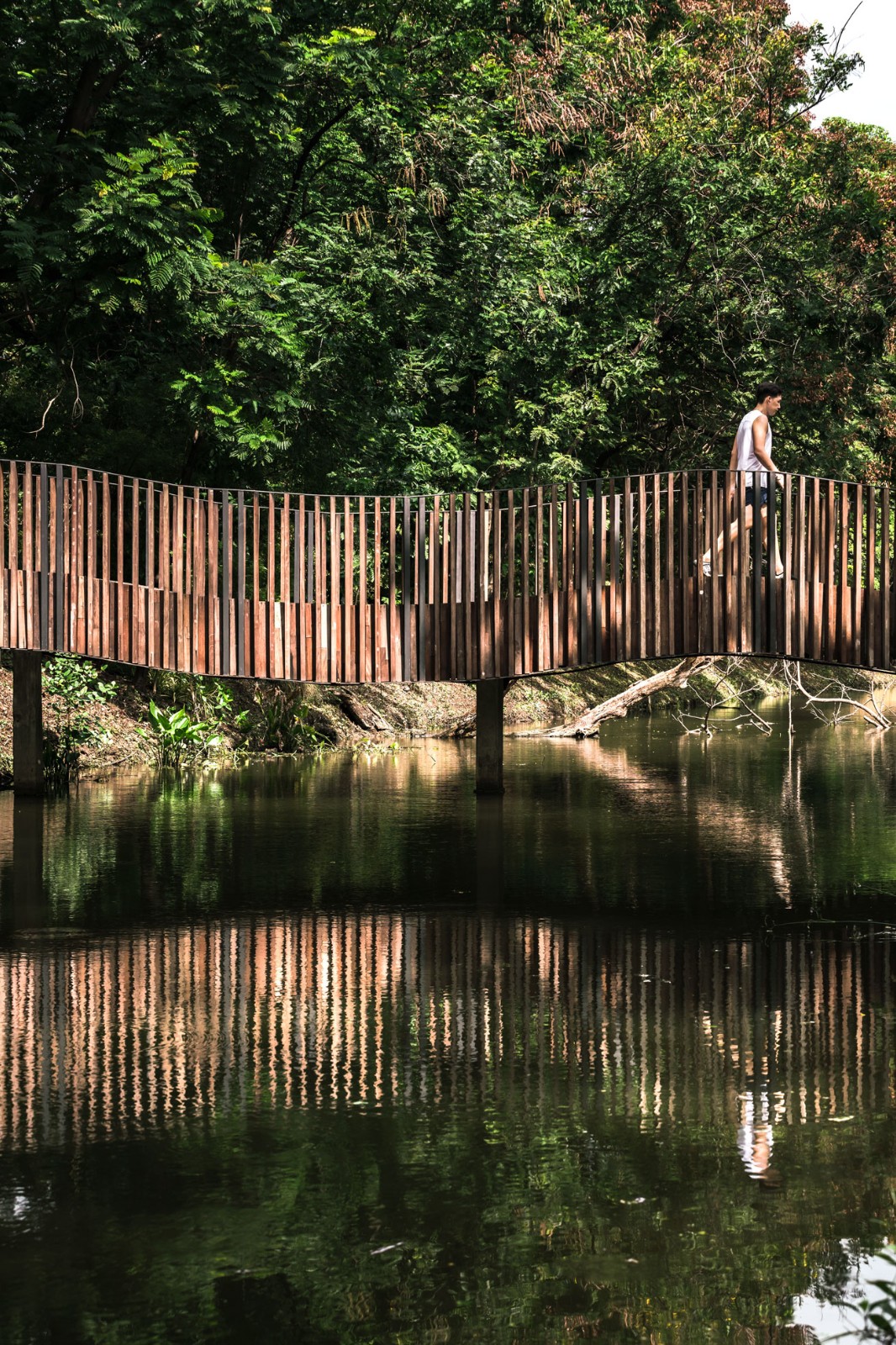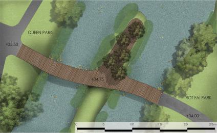 The bridge’s location is at the North end of central axis from the Queen Park and crossing over small watercourses, curving away from existing mature trees and landing in Rotfai Park at 2 m. lower elevation. The wave elevation of the bridge was employed to mitigate this level difference as well as paying homage to the traditional curved bridges in the Queen Park. The middle section of the bridge where it landed on a dike is curved out towards the Bird Sanctuary to create a room with tree crowns as roof, the semi-solid timber railing was raised around this room to form a blind with the integration of horizontal opening and wooden counter for birding activity.