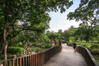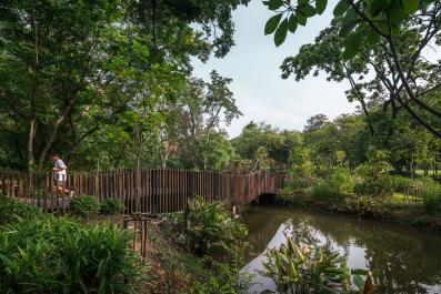 The Bird Wave Bridge, a 50 metre long pedestrian bridge crossing over small watercourse from Rotfai Park to H.M. Queen Sirikit Park at the Northern part of Bangkok aims to bridge not only the physical gaps but also the public projects’ complicated process and general perception of urban parks.The public green area in Bangkok is only about 3 m2 per person as opposed to minimum 9m2 per person as suggested by The World Health Organization (WHO) that every city should have. The 3 m2 per person figure already compiled every green area possible from large parks to planted road median. Obviously not only the city lacks green space in terms of area but also the sizeable ones where greater capacity enables broader use and increase of urban biodiversity.