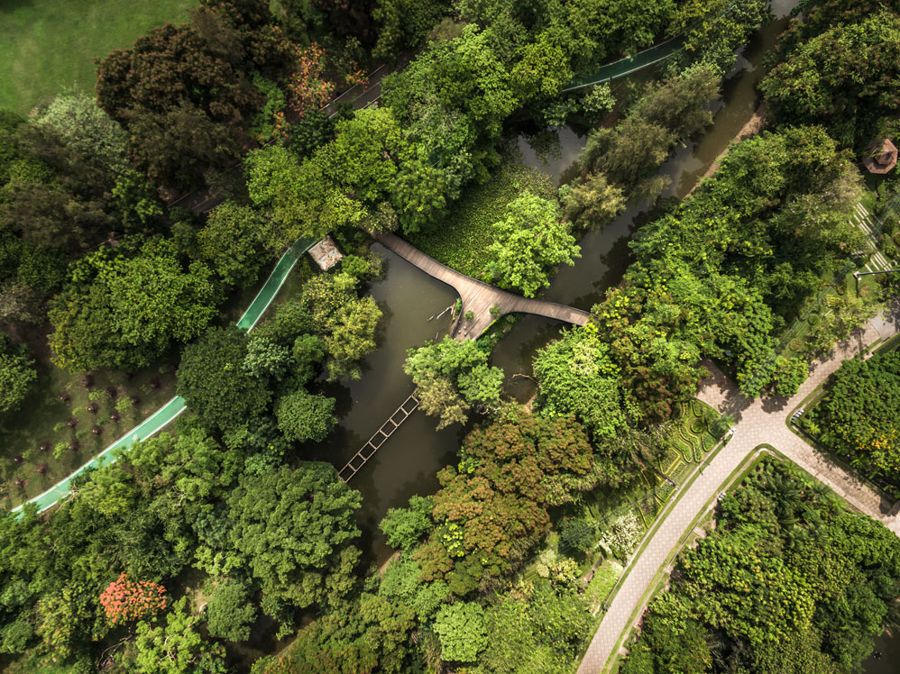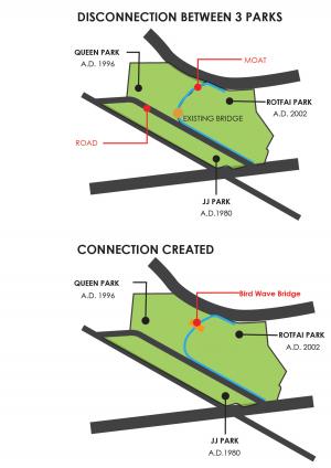 It is in the south end of the Bird Sanctuary that “The Bird Wave Bridge” was proposed by the landscape architect to the director board of the Queen Park in 2014 as the ‘trial’ connection to enable real use if the 3 parks are to be joined without having to wait for the realization of the whole masterplan. After 2 years of approval process, the 60,000 USD budget for the bridge was granted by Public Parks Department and the softscape budget was funded by H.M. Queen Sirikit Park Foundation. The bridge was opened to public in August 2016.