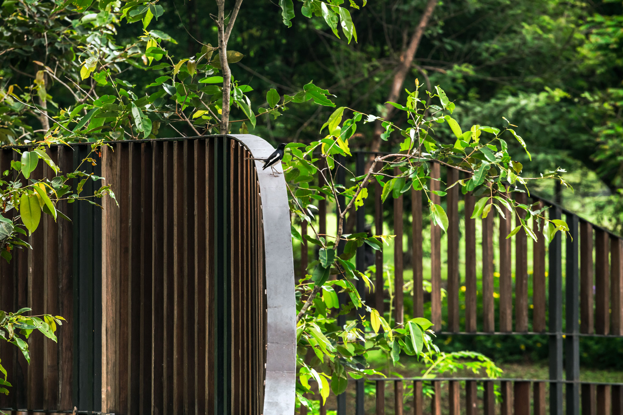 鳥翼橋主要由3種材料制成;基礎(chǔ)和支柱由鋼筋混凝土,黑色噴漆鋼用在了橋面結(jié)構(gòu)上,地板和扶手使用了風(fēng)化木材。因建設(shè)過程會(huì)影響周邊環(huán)境,在施工過程與與泰國(guó)鳥類保護(hù)協(xié)會(huì)進(jìn)行和合作,在周圍重新設(shè)計(jì)增加了適合小動(dòng)物適合棲息的地點(diǎn)。例如,在沿河緩坡處設(shè)計(jì)了適合棲息和覓食的空間,并種植了多種開花灌木和樹木,保護(hù)斜坡同時(shí)吸引昆蟲。最后,項(xiàng)目?jī)H剩籌資完善指示牌了。