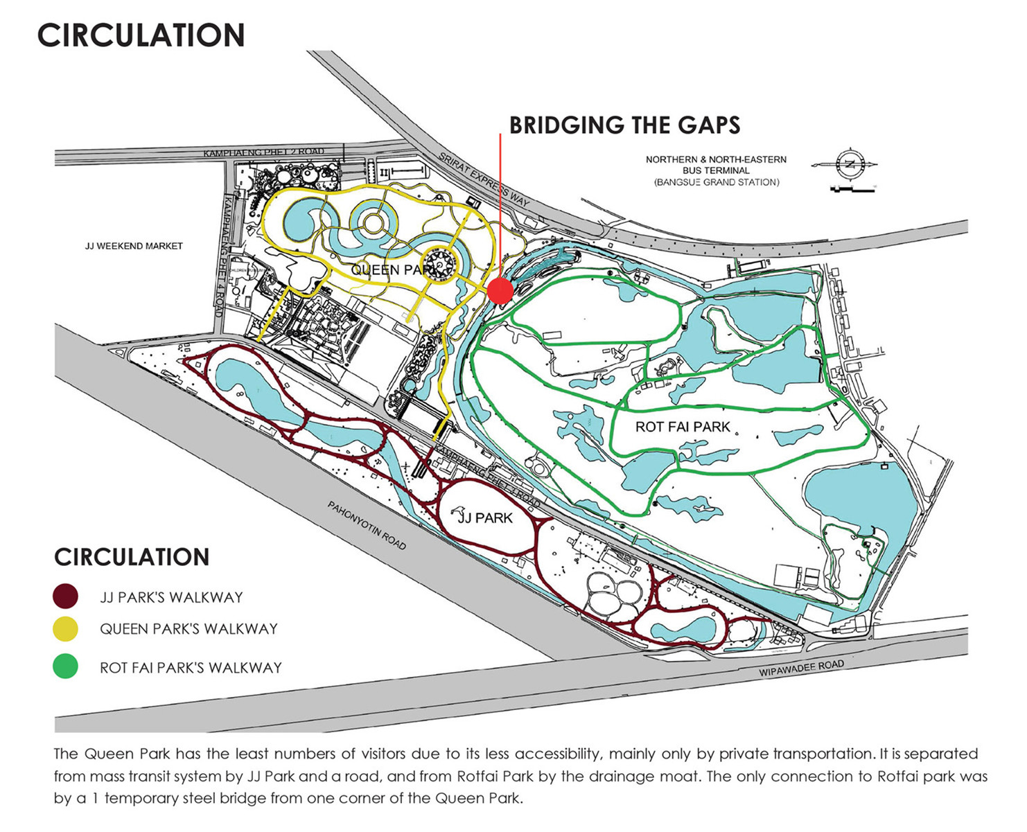 The Queen Park has the least numbers of visitors due to its less accessibility, mainly only by private transportation. It is separated from mass transit system by JJ Park and a road, and from Rotfai Park by the drainage moat. The only connection to Rotfai park was by a 1 temporary steel bridge from one corner of the Queen Park.