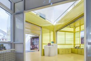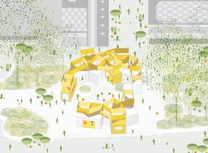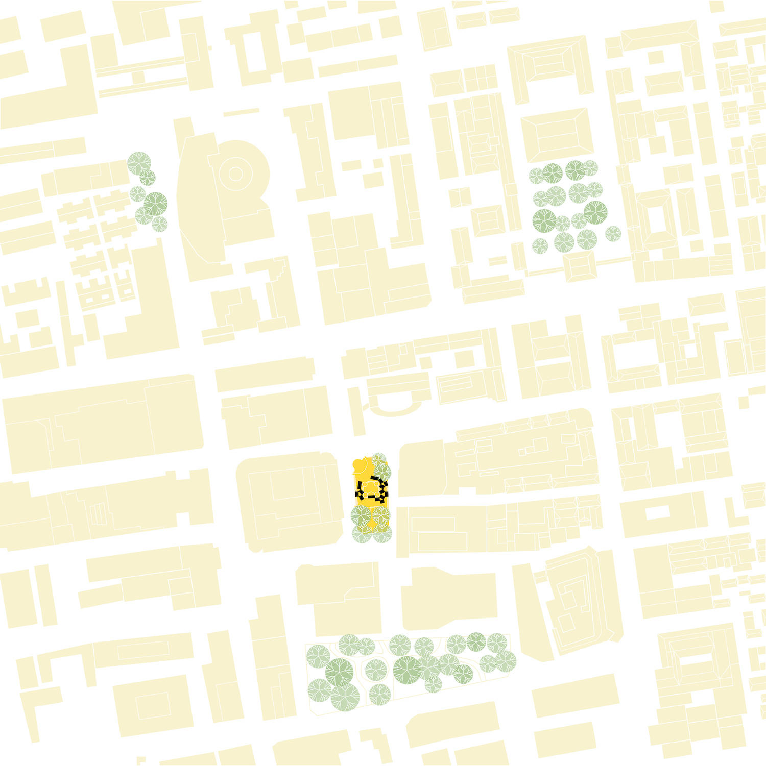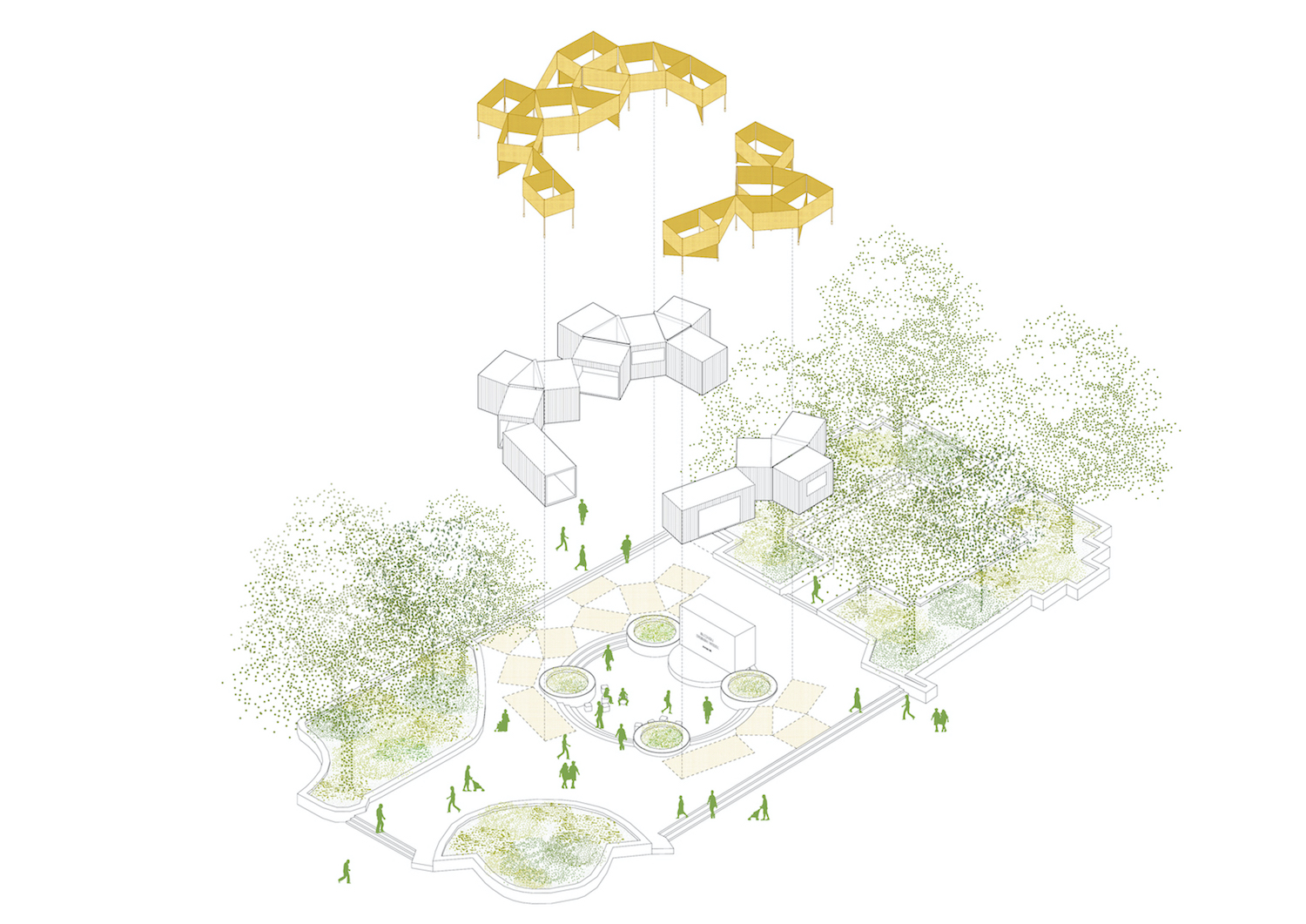 在小公園的更新改造中,我們對原有集裝箱進(jìn)行連接和重新組合,用一個藝術(shù)化的手法塑造出三組可以進(jìn)行文創(chuàng)展示的展廳,展廳之間或聚合成組、或蜿蜒連通,作為對蘇州園林中曲院回廊空間的一種當(dāng)代性解讀。其次,在展廳聚落的上空,黃色帷幔組合而成的天棚所帶來的獨(dú)特氣質(zhì),也凸顯了小公園在觀前街街區(qū)的文化地標(biāo)性,從城市中每一條街道前來的人們都會被醒目的天棚所吸引。本次改造設(shè)計(jì)通過加強(qiáng)小公園這個臨時建筑群體強(qiáng)烈的幾何特征和游園體驗(yàn),試圖能夠在喧鬧繁華的商業(yè)街街區(qū)中創(chuàng)造一個相對安靜的文創(chuàng)場所,讓大家在游園中感受文化,在設(shè)計(jì)中感受自然。
