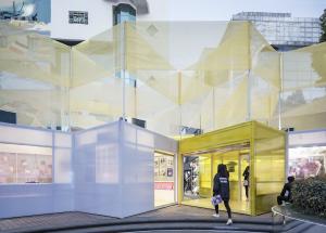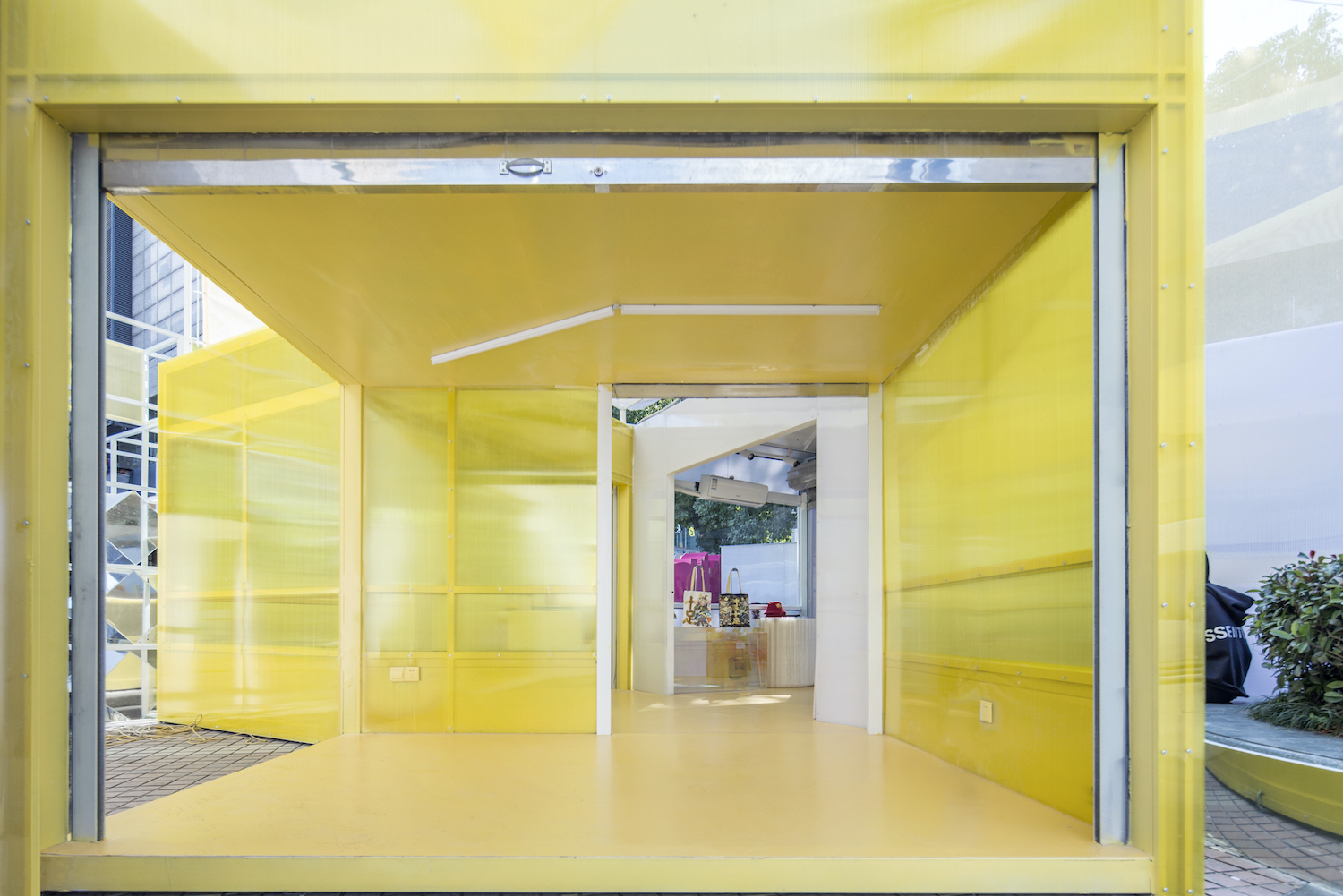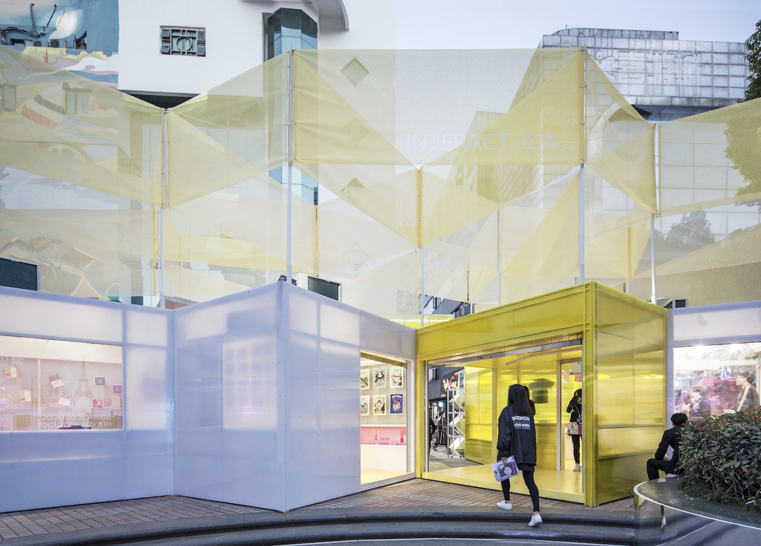 During the installation of this pocket park regeneration, we rearranged and attached the original containers to devise three groups of exhibition space with an artistic manner. As a modern interpretation of ambulatory in traditional Suzhou gardens, the exhibition spaces are either aggregated as groups or winded linearly through containers. Additionally, the canopy’s unique atmosphere, which made up with yellow valance, has also emphasised the pocket park as a cultural landmark at Guanqian Street. The striking canopy would attract people from every street in this area. This regeneration design is to enhance the geometric characteristic and costumers’ touring experience of this temporary construction to create a peaceful cultural site in the boisterous commercial strip for citizens to experience culture and environment in touring.