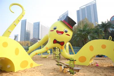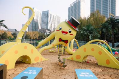 同時,將章魚觸角設(shè)計成有秋千、攀爬、滑梯、傳聲筒等游樂功能,豐富游樂項目使得兒童在通過考驗時增加了“難度”,同時增強故事主題性,使得主題更為生動具體,巨型章魚在游樂場入口形成了極具識別性的項目地標。