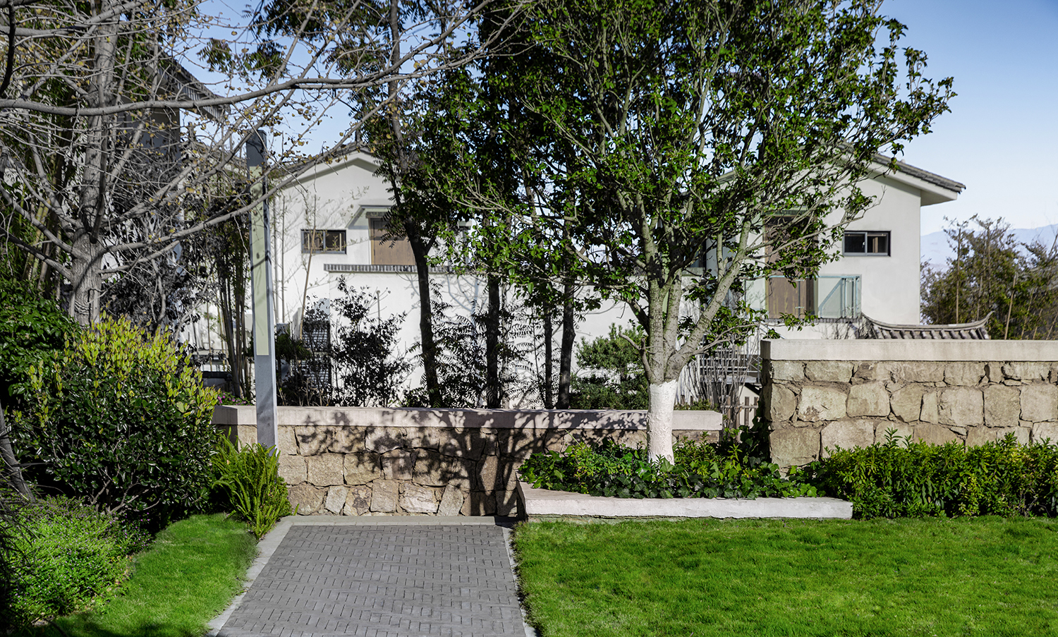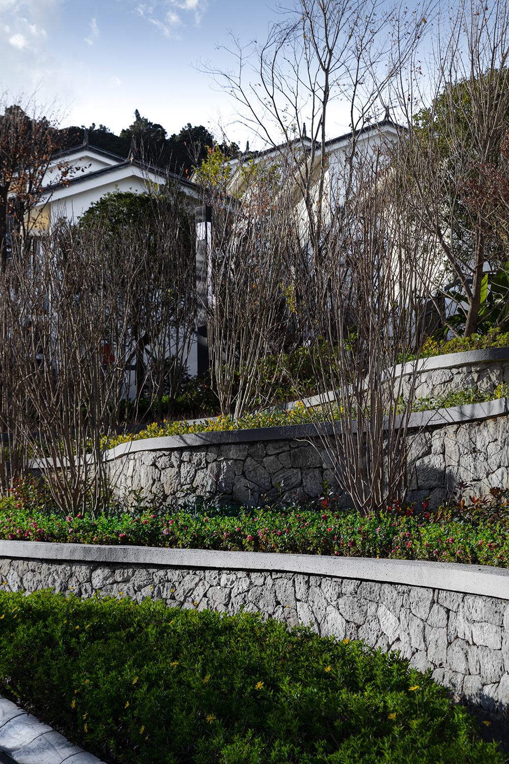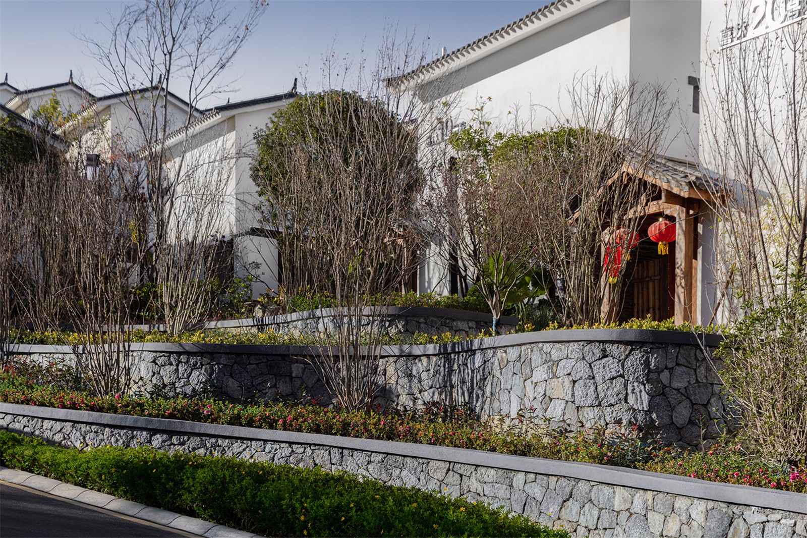 建筑上采用坐西向東的軸線布置,盡量減少對地貌特征的破壞,依山而建。用錯落有致的建筑群體形成層疊上升的布局特色,與綿綿起伏的蒼山相映,化白墻、青瓦為筆墨,繪就一副妙絕的山水潑墨。