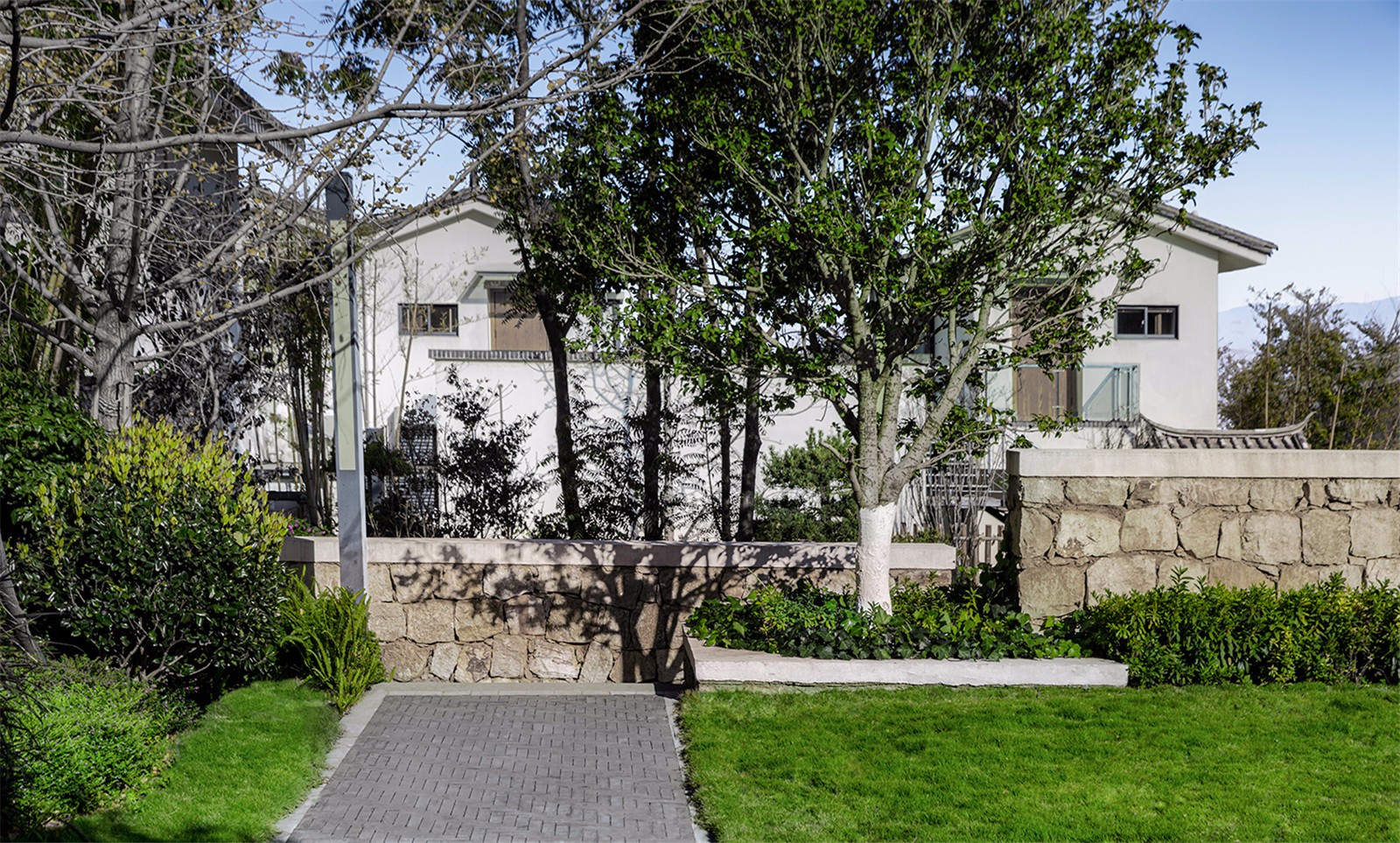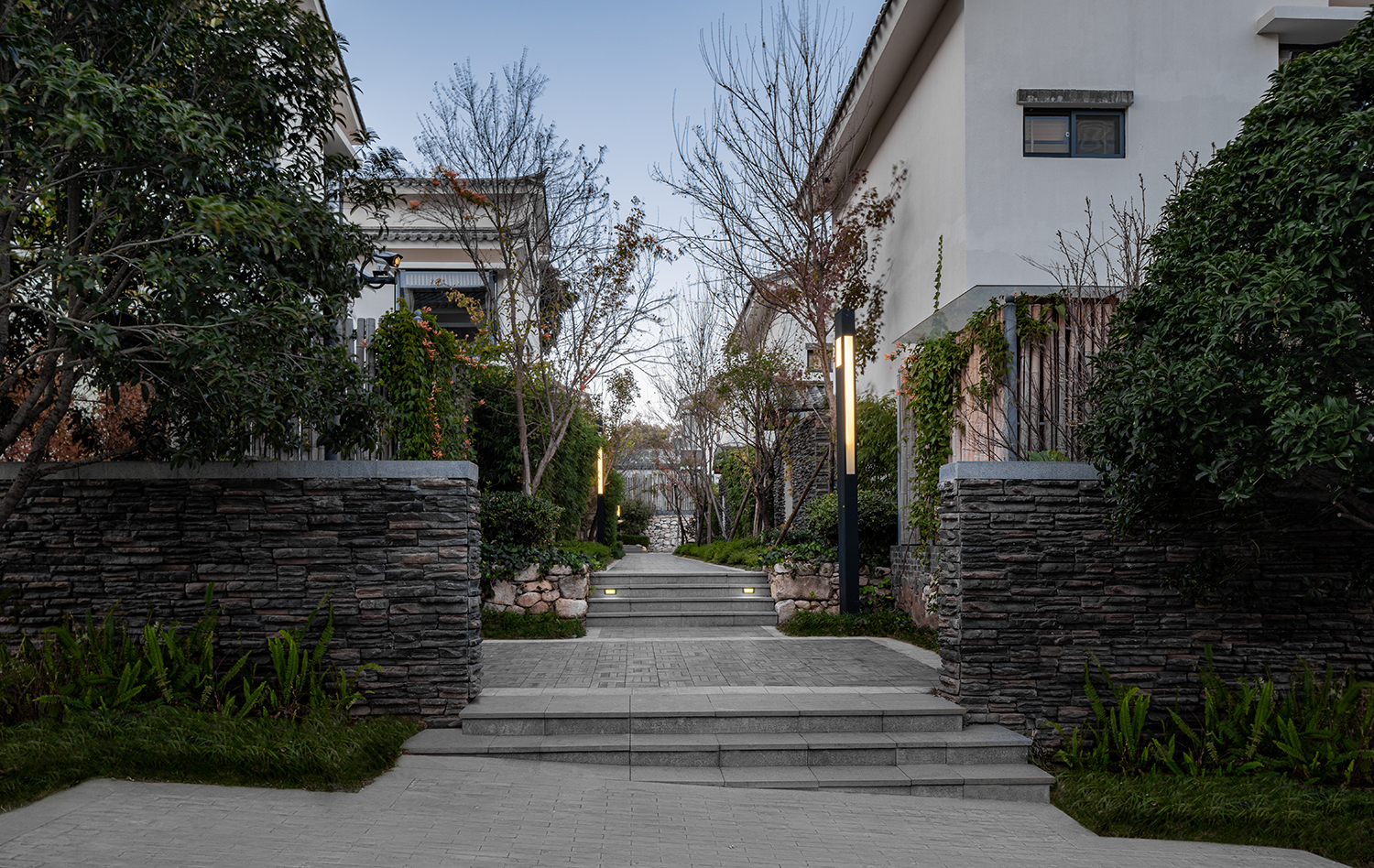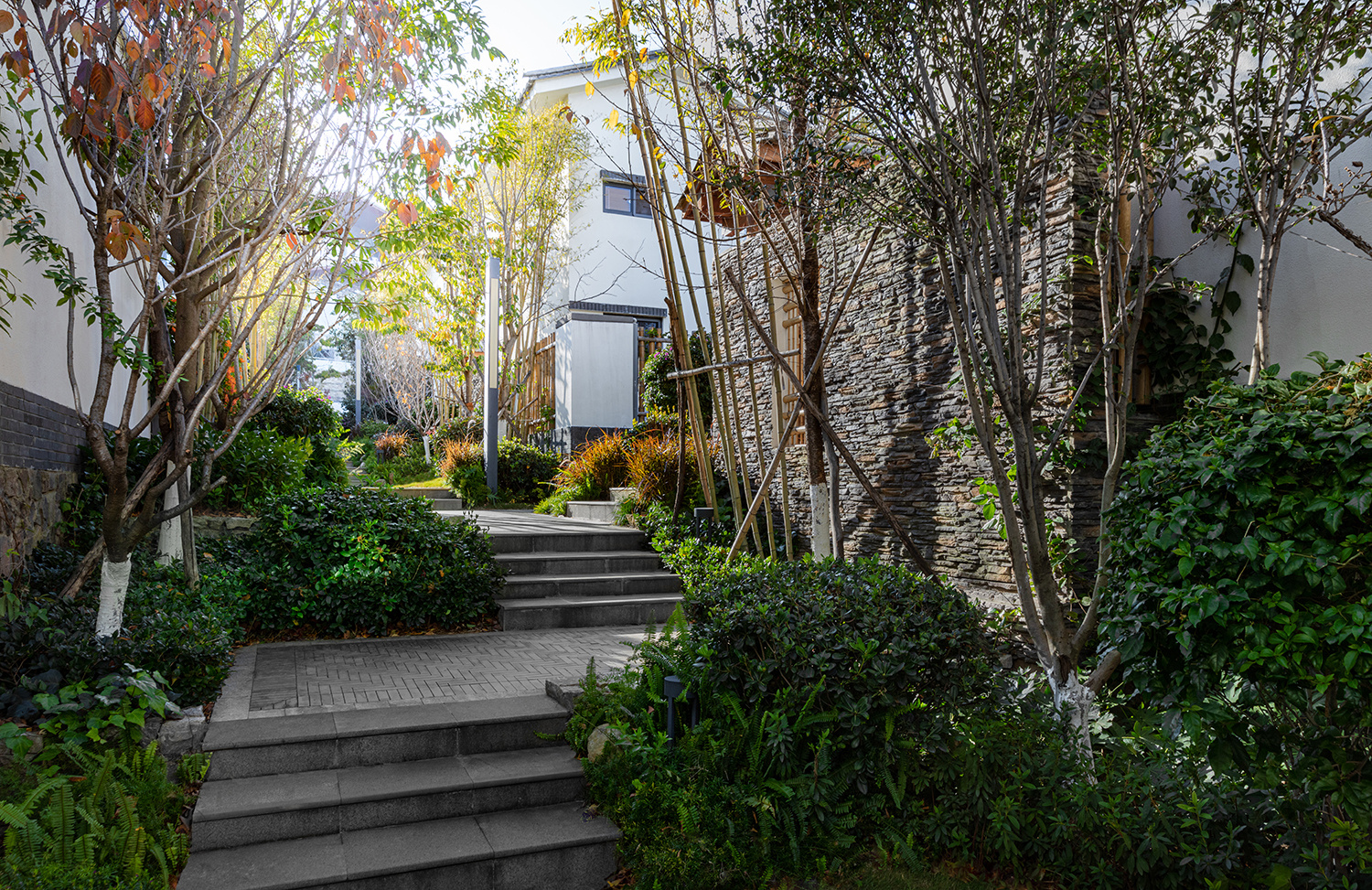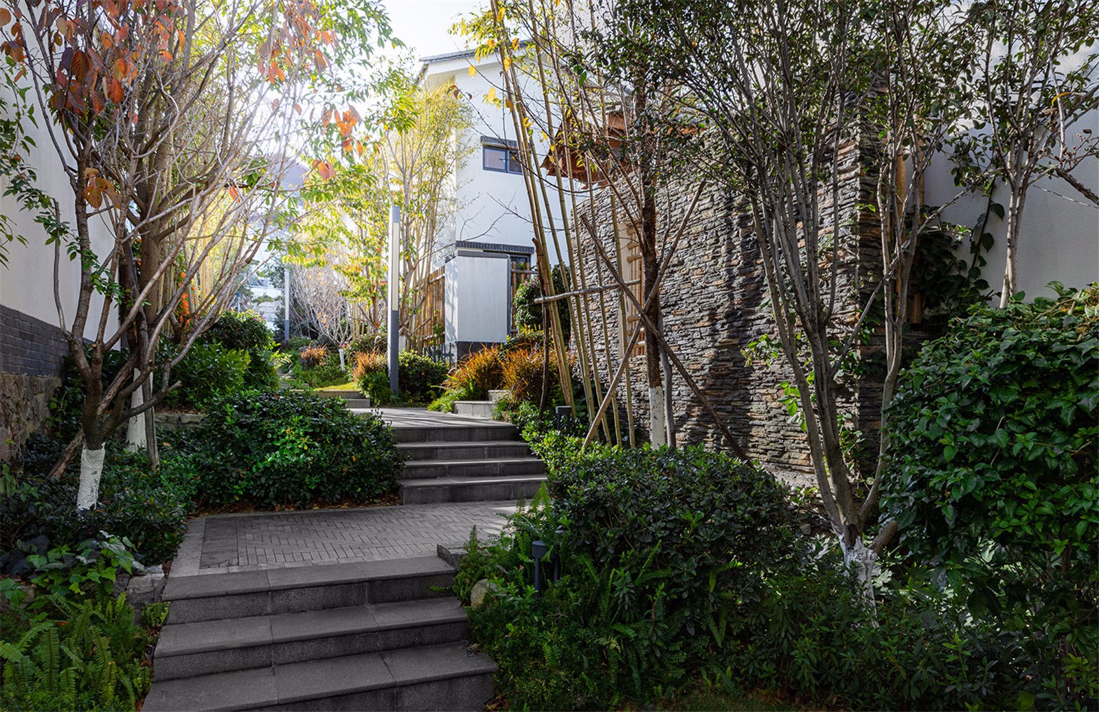 景觀上利用天然的高差優(yōu)勢,采用毛石、青磚、板巖等豐富的立面材料??坍嬇c周邊建筑的協(xié)調(diào)性,突出整體空間的延展性。