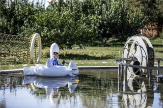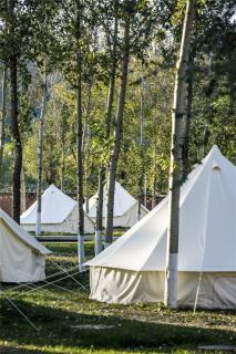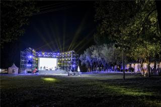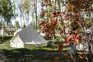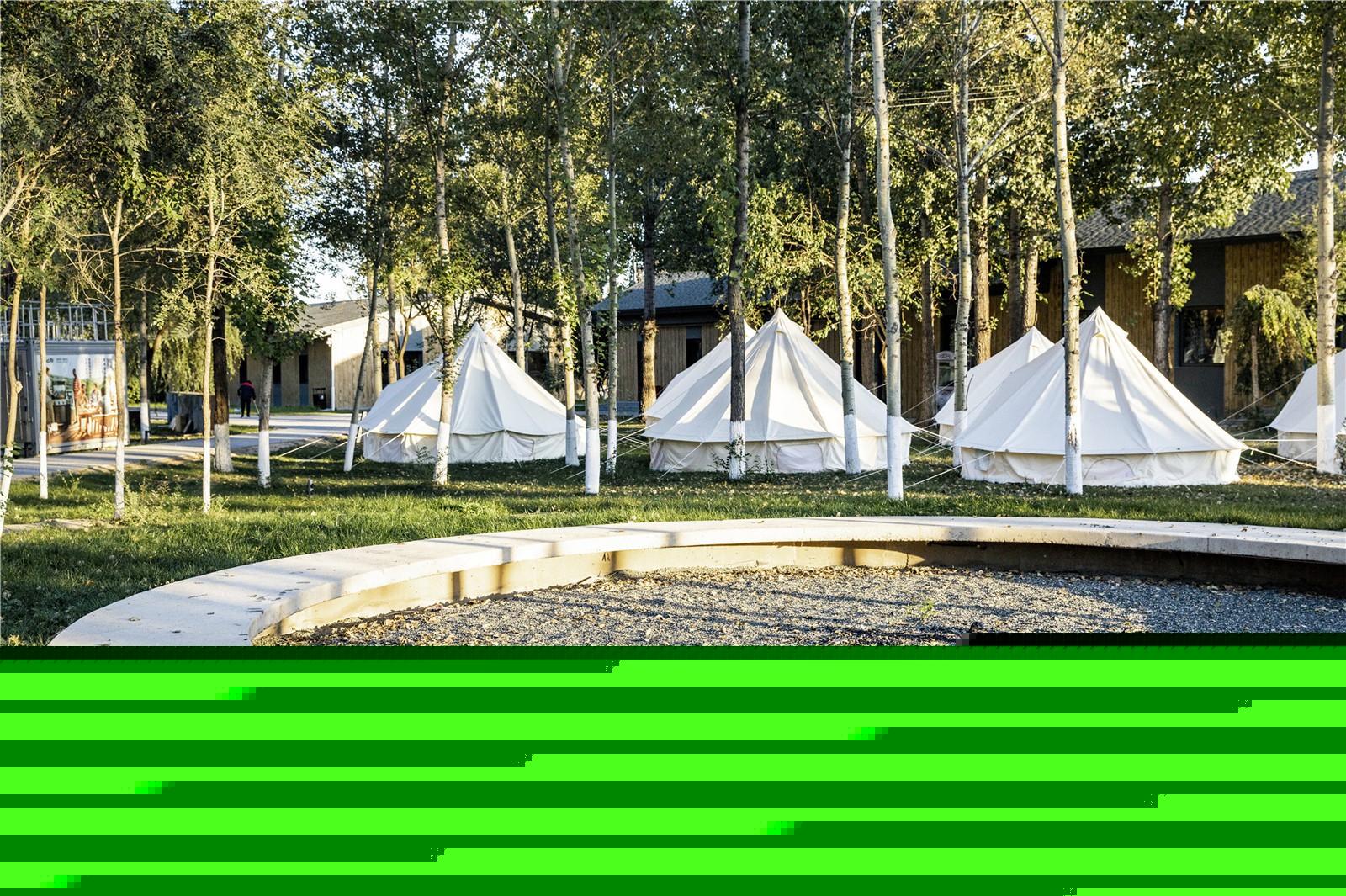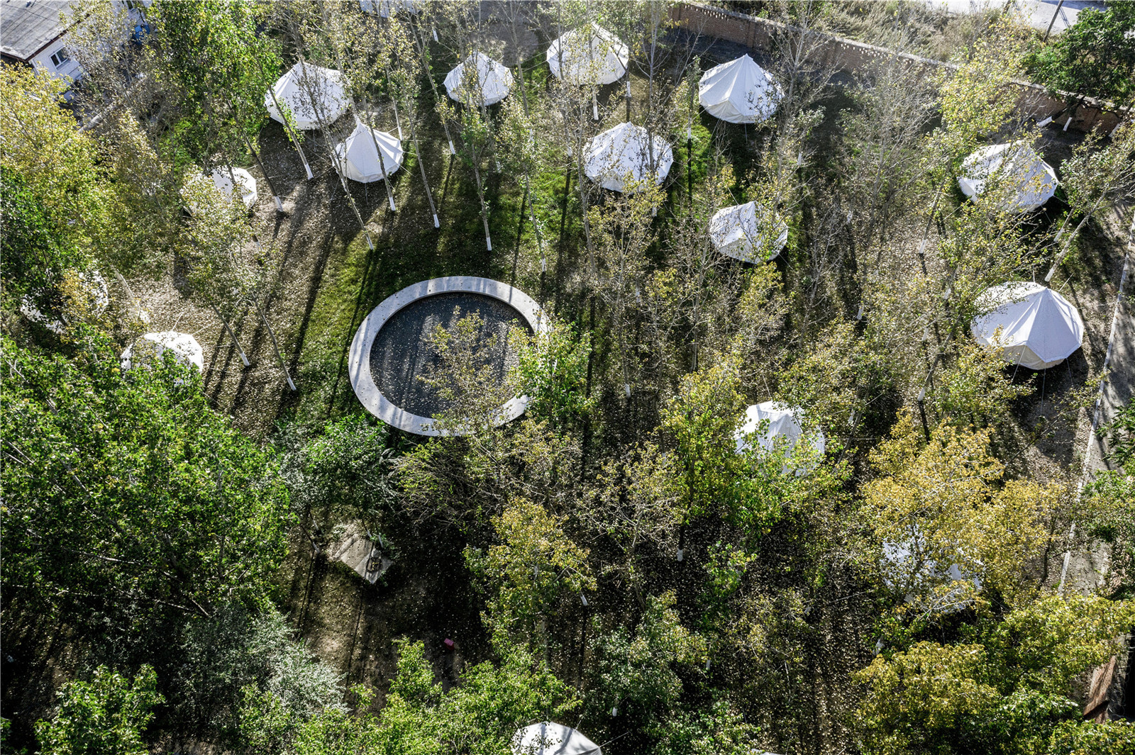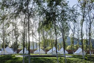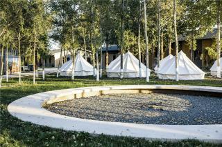 后場(chǎng)圍繞火塘,白色的露營(yíng)帳篷散布林間,供游客休憩,場(chǎng)地中心則設(shè)計(jì)下沉劇場(chǎng),能夠滿足篝火派對(duì)的狂歡。