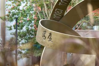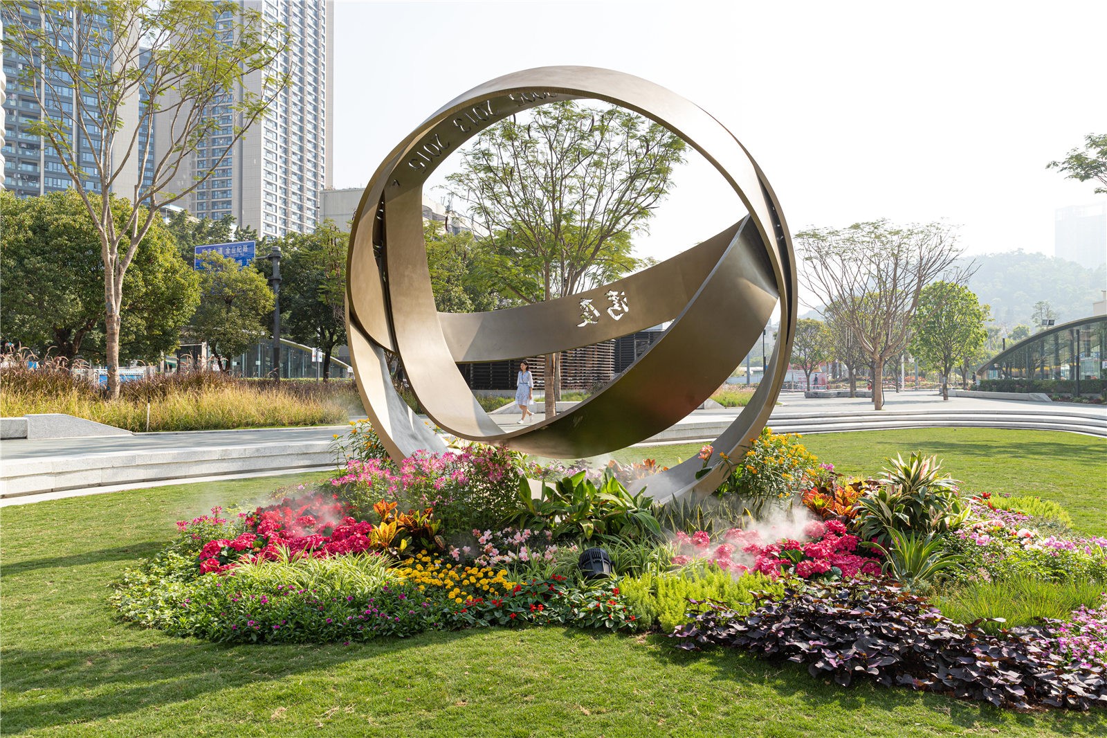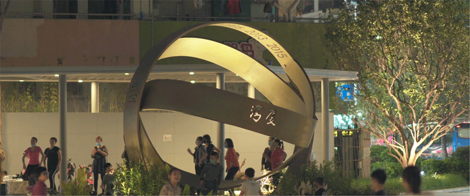 下沉草坪中央雕塑是一個復雜形體的設計,為了實現(xiàn)其莫比烏斯環(huán)的“多個平面交錯連續(xù)”的設計概念,設計團隊運營參數(shù)化設計工具進行了推敲。雕塑上鏤空雕刻了“灣廈”字樣,并有“與蛇口一起成長”以及相關蛇口發(fā)展的重要年份鐫刻其間,成為社區(qū)歷史的見證。