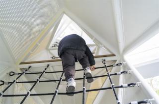 云朵小屋連接了云橋兩端,讓云橋在這個點成為一個閉合的整體。小屋內(nèi)擁有極其豐富的功能,攀巖、鉆網(wǎng)、益智面板,每一層都有完全不一樣的體驗,兒童可以在云朵小屋內(nèi)盡情的攀爬探索,體驗在云端游戲的樂趣。